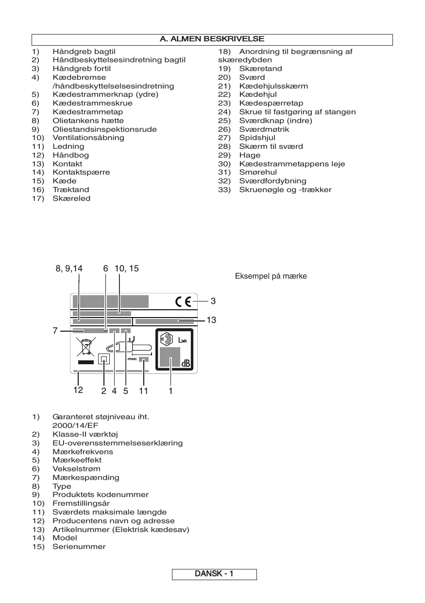 Håndgreb bagtil Håndbeskyttelsesindretning bagtil Håndgreb fortil Kædebremse /håndbeskyttelselsesindretning Kædestrammerknap (ydre) Kædestrammeskrue Kædestrammetap Olietankens hætte Oliestandsinspektionsrude Ventilationsåbning Ledning Håndbog Kontakt Kontaktspærre Kæde Træktand Skæreled 8, 9,14 6 10, 15 Eksempel på mærke