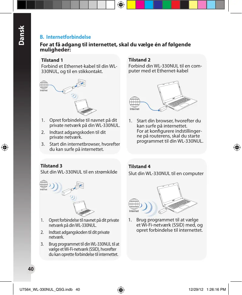 B. Internetforbindelse For at få adgang til internettet, skal du vælge én af følgende muligheder: Tilstand 1 Forbind et Ethernet-kabel til din WL330NUL, og til en stikkontakt.
