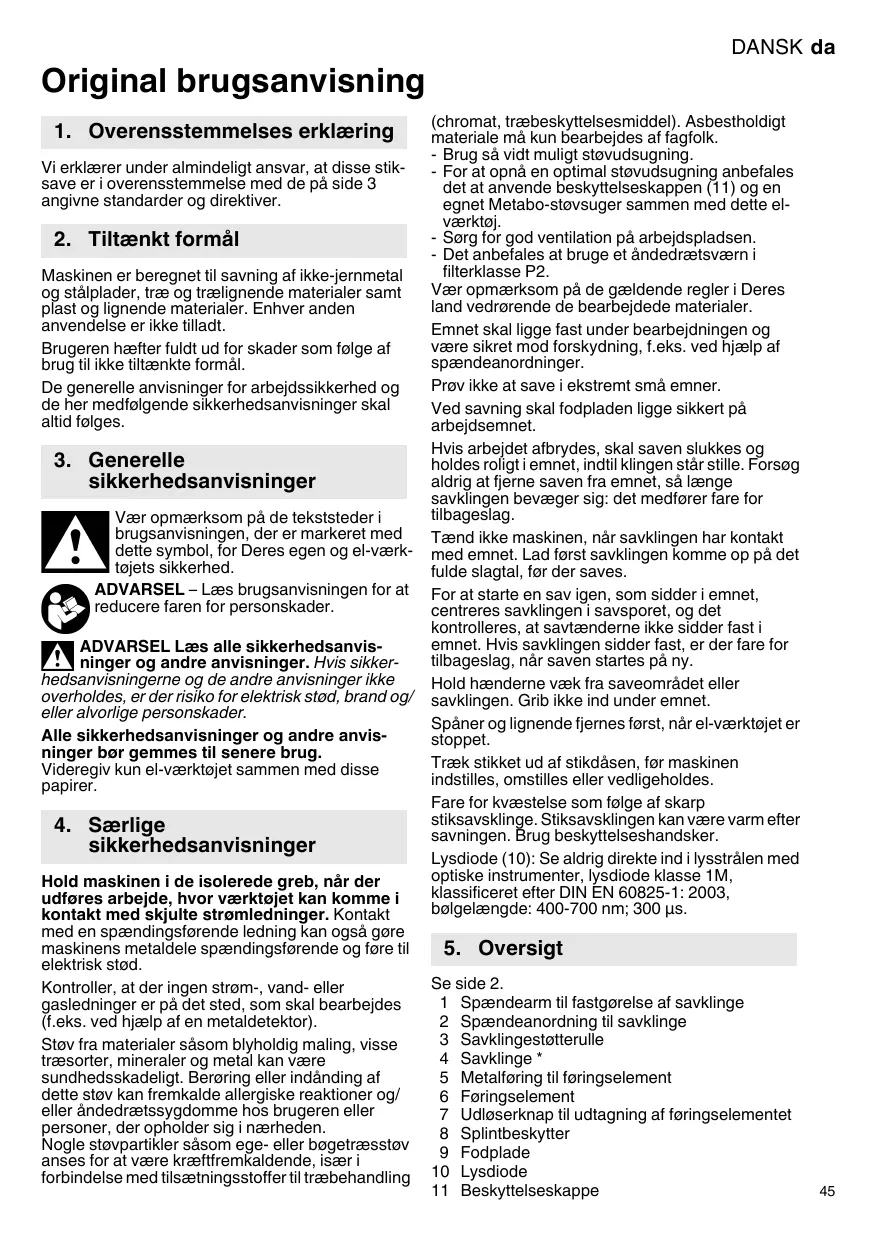 Maskinen er beregnet til savning af seks-jernmetal og staplader, træ og træ lignende materialer somt plast og lignende materialer. Enhver,anden anvendelse er ikke tilladt.