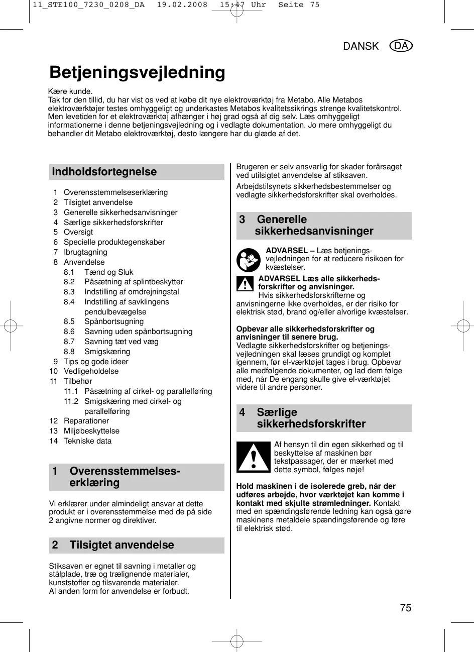 15:47 Uhr Seite 75 DANSK Betjeningsvejledning Kære kunde. Tak for den tillid, du har vist os ved at købe dit nye elektroværktøj fra Metabo. Alle Metabos elektroværktøjer testes omhyggeligt og underkastes Metabos kvalitetssikrings strenge kvalitetskontrol. Men levetiden for et elektroværktøj afhænger i høj grad også af dig selv. Læs omhyggeligt informationerne i denne betjeningsvejledning og i vedlagte dokumentation. Jo mere omhyggeligt du behandler dit Metabo elektroværktøj, desto længere har du glæde af det. Indholdsfortegnelse