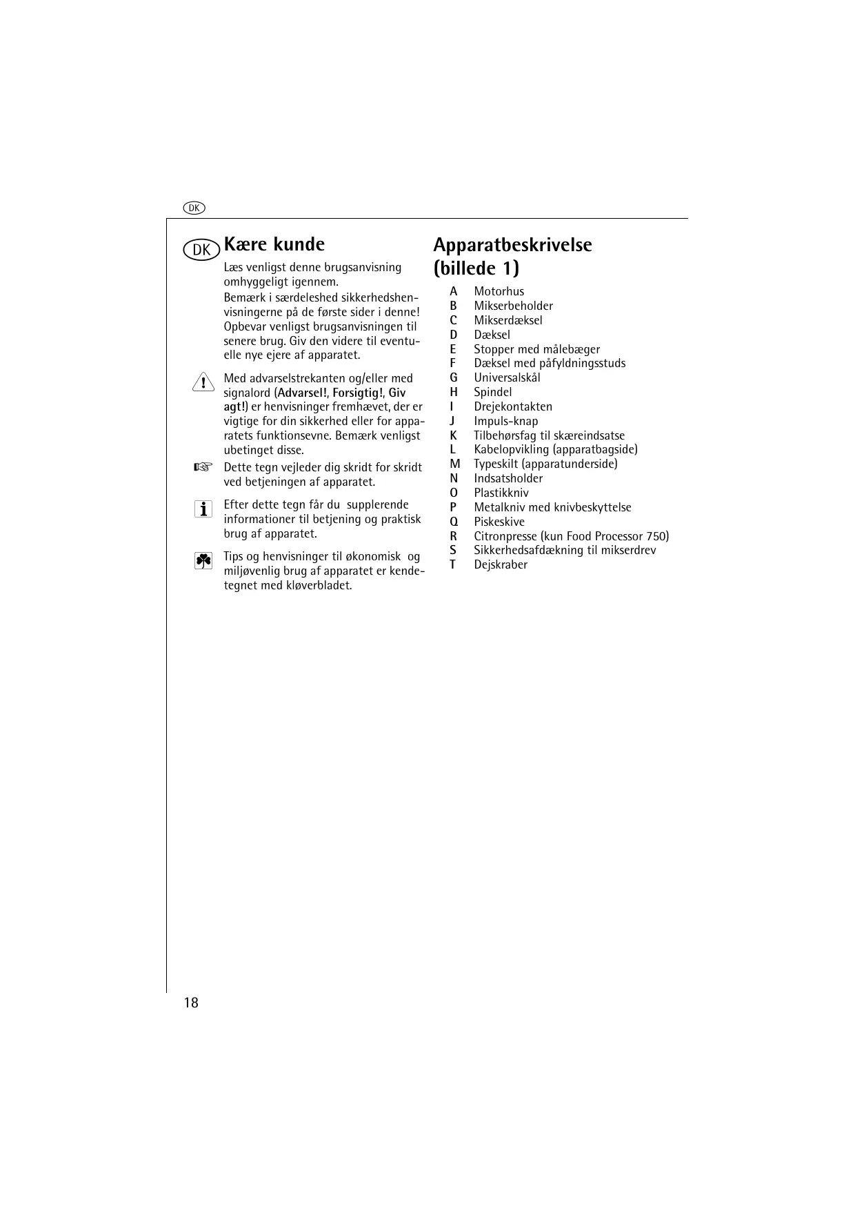 - Apparatet er kun beregnet til forarbejdning af levnedsmidler i husholdningen. Producenten hæfter ikke for eventuelle skader der forårsages af usagkyndig eller ikke-formålsbestemt drug.
