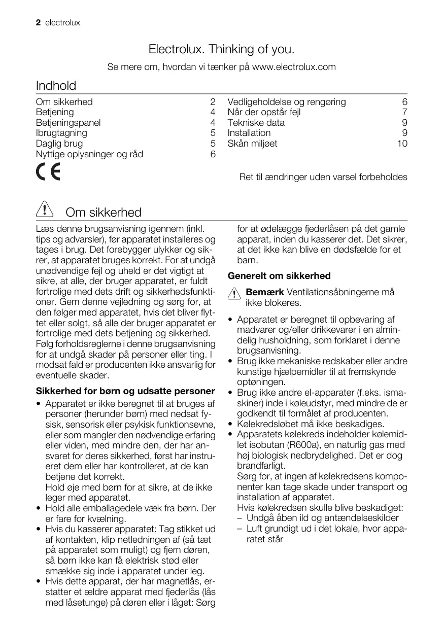 2 electrolux Electrolux. Thinking of you. Se mere om, hvordan vi tænker pâ www.electrolux.com Indhold Om sikkerhed 2 Vediigeholdelse og rengaring 6 Betjening 4 Nàr der opstàr fel 7 Betjeningspanel 4 Tekniske data 9 lbrugtagning 5 Installation 9 Daglig brug 5 Skän miloet 10 Nyttige oplysninger og räd 6
