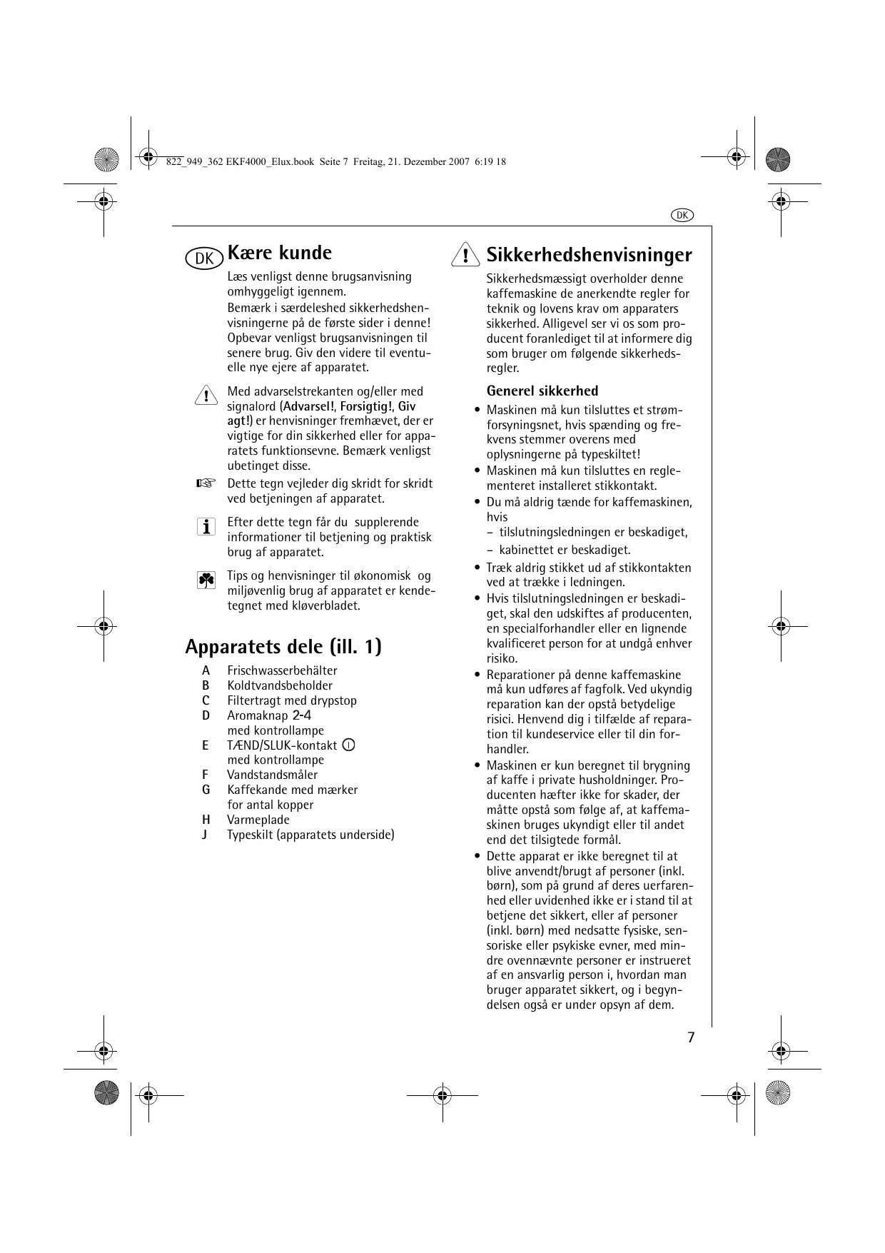 Læs venligst denne brugsanvisning omhyggeligt igennem. Bemærk i særdeleshed sikkerhedshen- visningerne pà de forste sider i denne! Opbevar venligst brugsanvisningen til senere brug. Giv den videre til eventu- elle nye ejere af apparatet. Med advarselstrekanten og/eller med signalord (Advarsel!, Forsigtig!, Giv agt!) er henvisninger fremhævet, der er vigtige for din sikkerhed eller for appa- ratets funktionsevne. Bemærk venligst ubetinget disse. Dette tegn vejleder dig skridt for skridt ved betjeningen af apparatet. Efter dette tegn fär du supplerende informationer til betjening og praktisk brug af apparatet. Tips og henvisninger til okonomisk og miljevenlig brug af apparatet er kende- tegnet med kloverbladet. Apparatets dele (ill. 1)