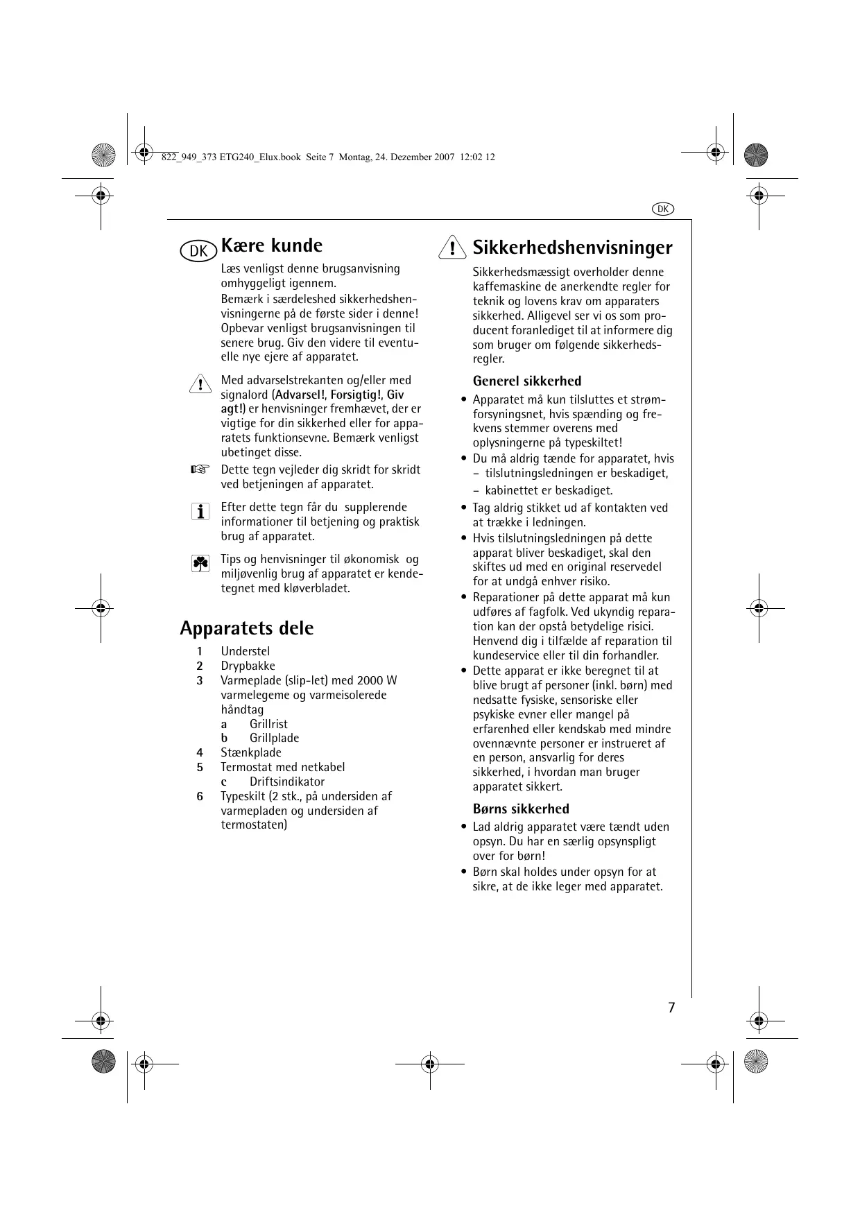 Understel Drypbakke Varmeplade (slip-let) med 2000 W varmelegeme og varmeisolerede håndtag Grillrist Grillplade Stænkplade Termostat med netkabel Driftsindikator Typeskilt (2 stk., på undersiden af varmepladen og undersiden af termostaten) 1 Sikkerhedshenvisninger Sikkerhedsmæssigt overholder denne kaffemaskine de anerkendte regler for teknik og lovens krav om apparaters sikkerhed. Alligevel ser vi os som producent foranlediget til at informere dig som bruger om følgende sikkerhedsregler. Generel sikkerhed