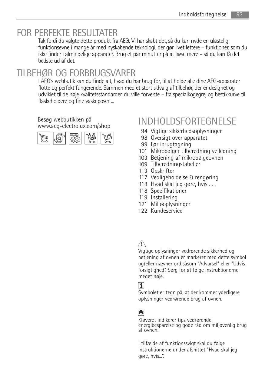 INDHOLDSFORTEGNELSE 94 Vigtige sikkerhedsoplysninger 98 Oversigt over apparatet 99 For ibrugtagning 101 Mikrobolger tilberedning vejledning 103 Betjening af mikrobglgeovnen 109 Tilberedningstabeller 113 Opskrifter 117 Vedligeholdelse € rengoring 118 Hvad skal jeg gore, hvis 118 Specifikationer 119 Installering 121 Miljooplysninger 122 Kundeservice
