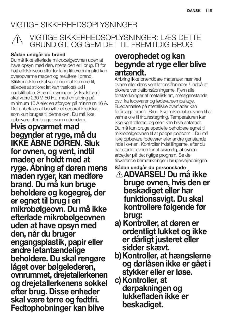 GRUNDIGT, OG GEM DET TIL FREMTIDIG BRUG Sådan undgår du brand Du må ikke efterlade mikrobølgeovnen uden at have opsyn med den, mens den er i brug. Et for højt effektniveau eller for lang tilberedningstid kan overopvarme maden og resultere i brand. Stikkontakten skal være nem at komme til, således at stikket let kan trækkes ud i nødstilfælde. Strømforsyningen (vekselstrøm) skal være 230 V, 50 Hz, med en sikring på minimum 16 A eller en afbryder på minimum 16 A. Det anbefales at benytte et separat kredsløb, som kun bruges til denne ovn. Du må ikke opbevare eller bruge ovnen udendørs. overophedet og kan begynde at ryge eller blive antændt. Anbring ikke brændbare materialer nær ved ovnen eller dens ventilationsåbninger. Undgå at blokere ventilationsåbningerne. Fjern alle forstærkninger af metallisk art, metalgenstande osv. fra fødevarer og fødevareemballage. Buedannelse på metalliske overflader kan forårsage brand. Brug ikke mikrobølgeovnen til at varme olie til friturestegning. Temperaturen kan ikke kontrolleres, og olien kan blive antændt. Du må kun bruge specielle beholdere egnet til mikrobølgeovnen til at poppe popcorn i. Du må ikke opbevare fødevarer eller andre genstande inde i ovnen. Kontroller indstillingerne, efter du har startet ovnen for at sikre dig, at ovnen arbejder på det rigtige program. Se de tilsvarende bemærkninger i brugervejledningen. Sådan undgår du personskade Hvis opvarmet mad begynder at ryge, må du IKKE ÅBNE DØREN. Sluk for ovnen, og vent, indtil maden er holdt med at ryge. Åbning af døren mens ADVARSEL! Du må ikke maden ryger, kan medføre bruge ovnen, hvis den er brand. Du må kun bruge beskadiget eller har beholdere og kogegrej, der funktionssvigt. Du skal er egnet til brug i en kontrollere følgende før mikrobølgeovn. Du må ikke brug: efterlade mikrobølgeovnen a) Kontroller, at døren er uden at have opsyn med ordentligt lukket og ikke den, når du bruger er dårligt justeret eller engangsplastik, papir eller sidder skævt. andre letantændelige beholdere. Du skal rengøre b)Kontroller, at hængslerne og dørlåsen ikke er gået i låget over bølgelederen, stykker eller er løse. ovnrummet, drejetallerkenen og drejetallerkenens sokkel c) Kontroller, at dørpakningen og efter brug. Disse enheder lukkefladen ikke er skal være tørre og fedtfri. beskadiget. Fedtophobninger kan blive
