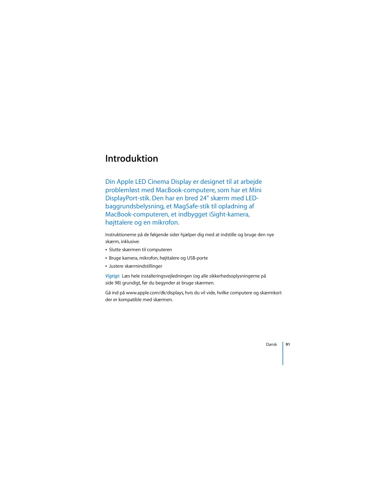 Introduktion Din Apple LED Cinema Display er designet til at arbejde problemlgst med MacBook-computere, som har et Mini DisplayPort-stik. Den har en bred 24" skærm med LED- baggrundsbelysning, et MagSafe-stik til opladning af MacBook-computeren, et indbygget iSight-kamera, hojttalere og en mikrofon. Instruktionerne pà de folgende sider hjælper dig med at indstlle og bruge den nye skærm, inklusive: + Slutte skærmen til computeren + Bruge kamera, mikrofon, hojttalere og USB-porte + Justere skærmindstilinger Vigtigt: Læs hele installeringsvejledningen (og alle sikkerhedsoplysningerne pà side 98) grundigt, far du begynder at bruge skærmen. Gë ind pâ wwwapple.com/dk/displays, hvis du vil vide, hvilke computere og skærmkort der er kompatible med skærmen. Dansk