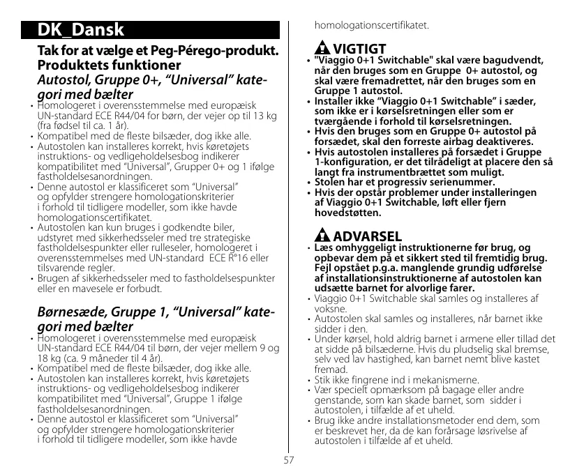 VIGTIGT Tak for at vælge et Peg-Pérego-produkt. Produktets funktioner Autostol, Gruppe 0+, “Universal” kategori med bælter