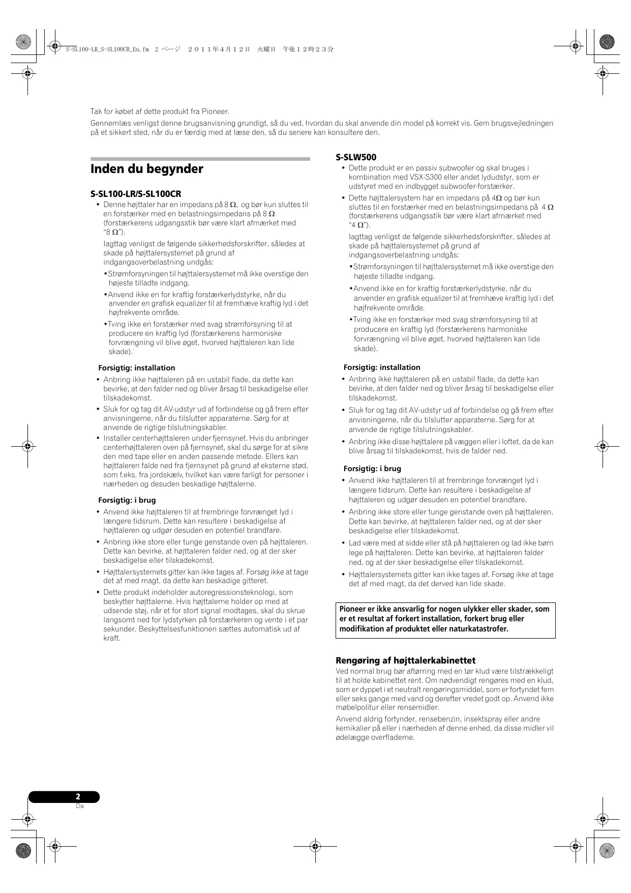 Pioneer er ikke ansvarlig for nogen ulykker eller skader, som er et resultat af forkert installation, forkert brug eller modifikation af produktet eller naturkatastrofer.