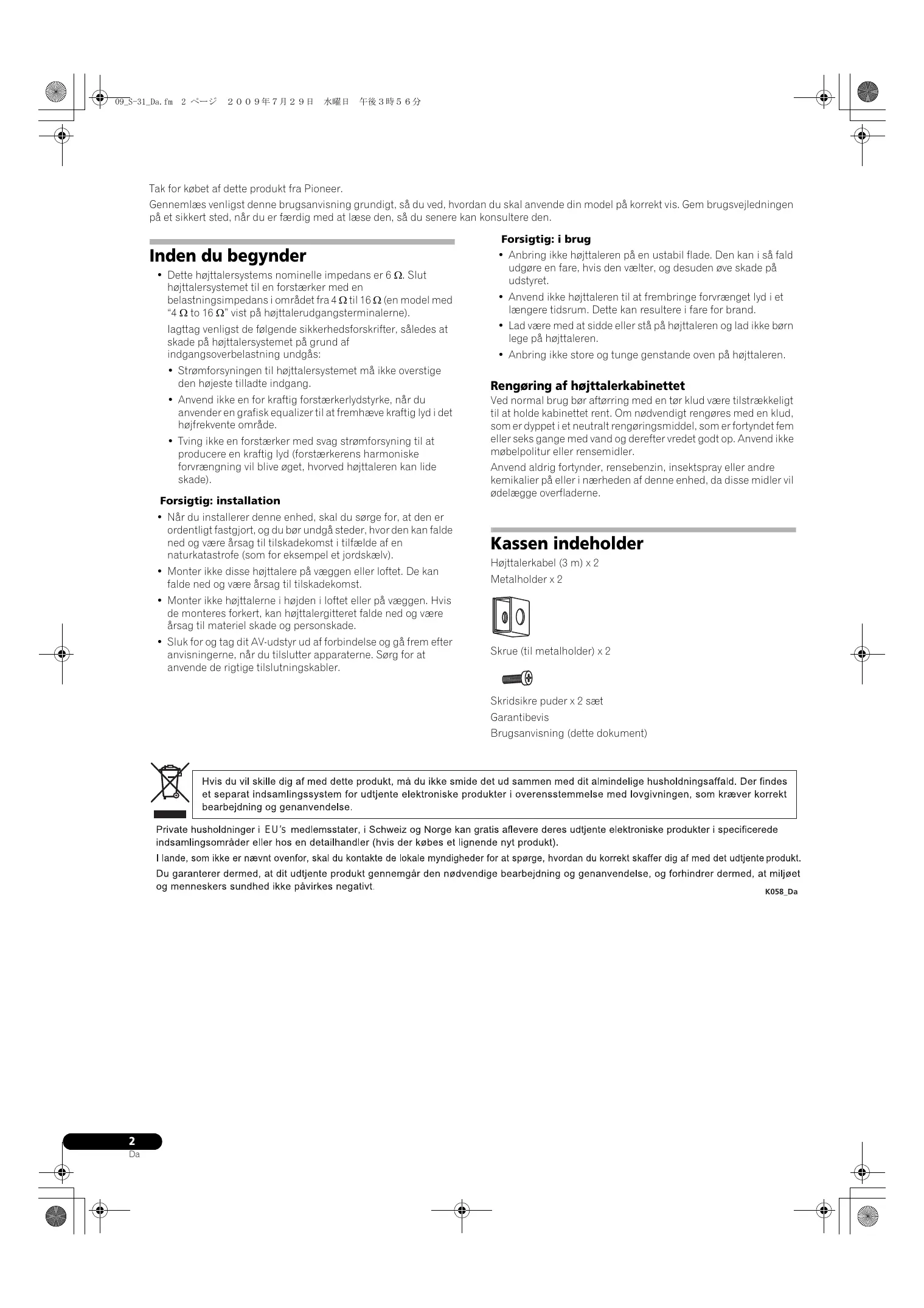 Published by Pioneer Corporation. Copyright © 2009 Pioneer Corporation. Alle rettigheder forbeholdes.