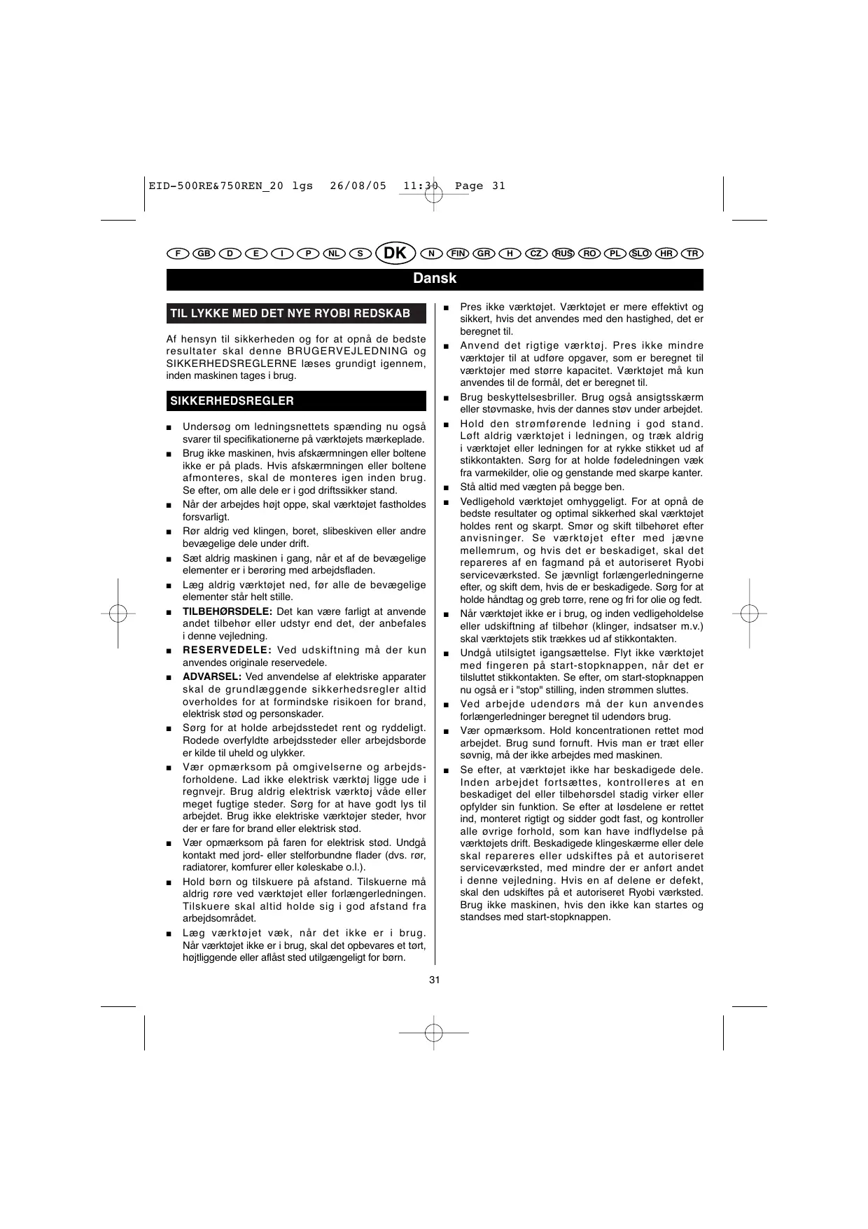 TIL LYKKE MED DET NYE RYOBI REDSKAB Af hensyn til sikkerheden og for at opnå de bedste resultater skal denne BRUGERVEJLEDNING og SIKKERHEDSREGLERNE læses grundigt igennem, inden maskinen tages i brug.