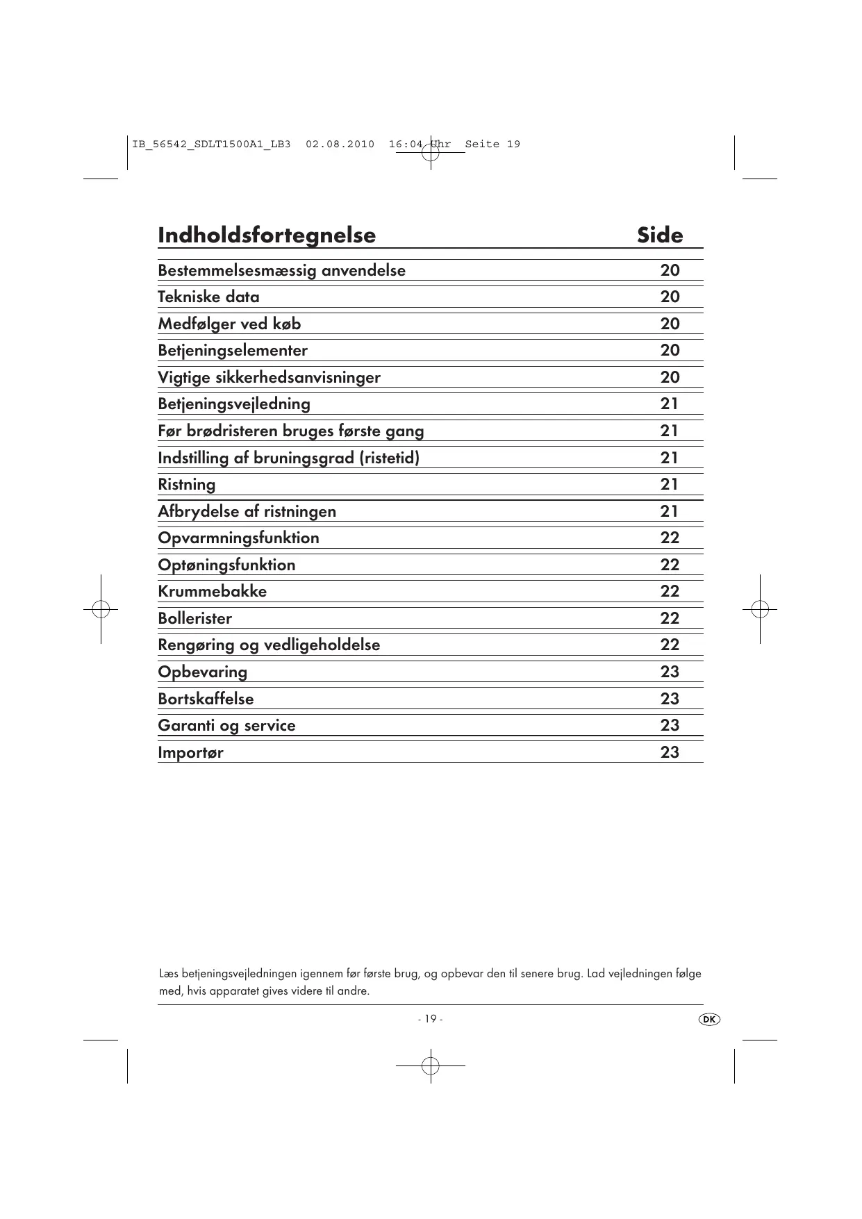 Indholdsfortegnelse Side Bestemmelsesmæssig anvendelse 20 Tekniske data 20 Medfslger ved kgb 20 Betjeningselementer 20 Vigtige sikkerhedsanvisninger 20 Betjeningsveiledning 21 For brodristeren bruges forste gang 21 Indstilling af bruningsgrad (ristetid) 21 Ristning 21 Afbrydelse af ristningen 21 Opvarmningsfunktion 22 Optaningsfunktion 22 Krummebakke 22 A d se Bollerister 22 7 Renggring og vedligeholdelse 22 Opbevaring 23 Bortskaffelse 23 Garanti og service 23 Importar 23 Læs befjeningsveiledningen igennem far farste brug, og opbevar den til senere brug. Lad veiledhingen folge med, hvis apparatet gives videre til andre