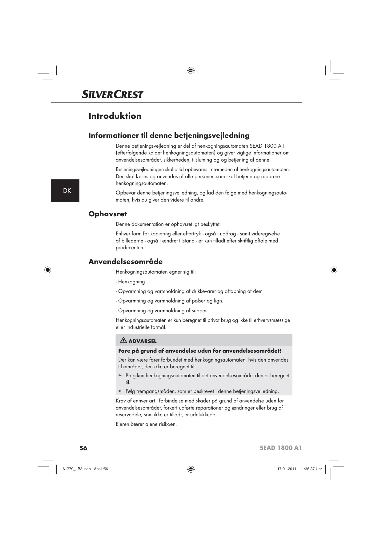 | | 61779 LB3indb 55 & Indholdsfortegnelse Informationer il denne befjeningsveiledning . 56 Ophavsret 56 Anvendelsesomräde 56 Advarselsinfo Bortskaffelse af emballagen . Opstilling og klargaring til brug. Tænd og sluk for henkogningsautomaten . Henkogning Opvarmning / varmholdning af væesker Rengsring af tappehanen . Afkalkning .… Grov leverpalse Sursod græskar. . .. Jordbærsyltetej. ..................................................... SEAD 1800 A1
