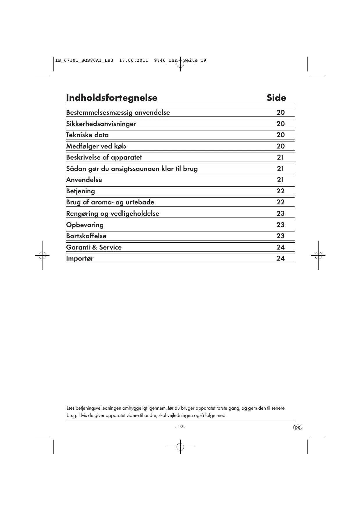 Indholdsfortegnelse Side Bestemmelsesmæssig anvendelse 20 Sikkerhedsanvisninger 20 Tekniske data 20 Medfslger ved kgb 20 Beskrivelse af apparatet 21 Sädan ger du ansigtssaunaen klar til brug 21 Anvendelse 21 Betjening 22 Brug af aroma- og urtebade 22 Renggring og vedligeholdelse 23 Opbevaring 23 Bortskaffelse 23 Garanti & Service 24 Importar 24