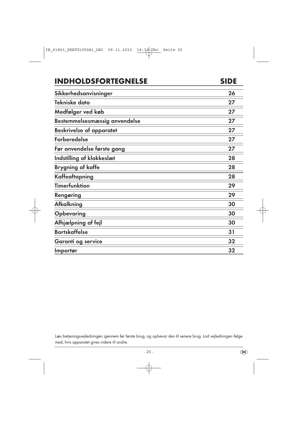 ED INDHOLDSFORTEGNELSE SIDE Sikkerhedsanvisninger 26 Tekniske data 27 Medfslger ved kgb 27 Bestemmelsesmæssig anvendelse 27 Beskrivelse af apparatet 27 Forberedelse 27 For anvendelse forste gang 27 Indstilling af klokkeslæt 28 Brygning af kaffe 28 Kaffeaftapning 28 Timerfunktion 29 Rengporing 29 Afkalkning 30 h an | Opbevaring 30 | Afhjælpning af feil 30 Bortskaffelse 31 Garanti og service 32 Importar 32