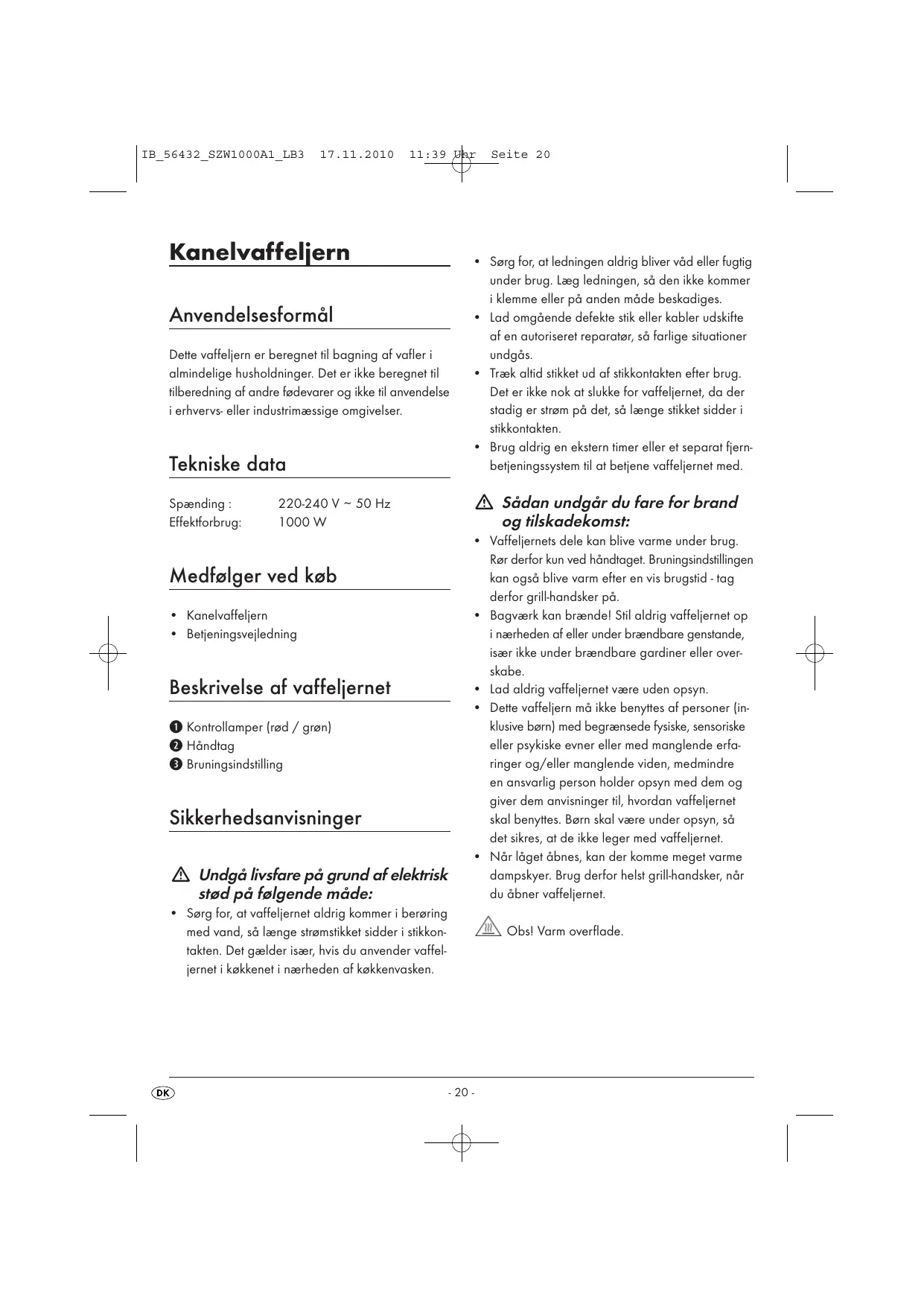 Dette vaffeljern er beregnet il bagning af vale i almindelige husholdninger. Det er ikke beregnet til tilberedning af andre fadevarer og ikke til anvendelse ï erhvervs- eller industrimæssige omgivelser.