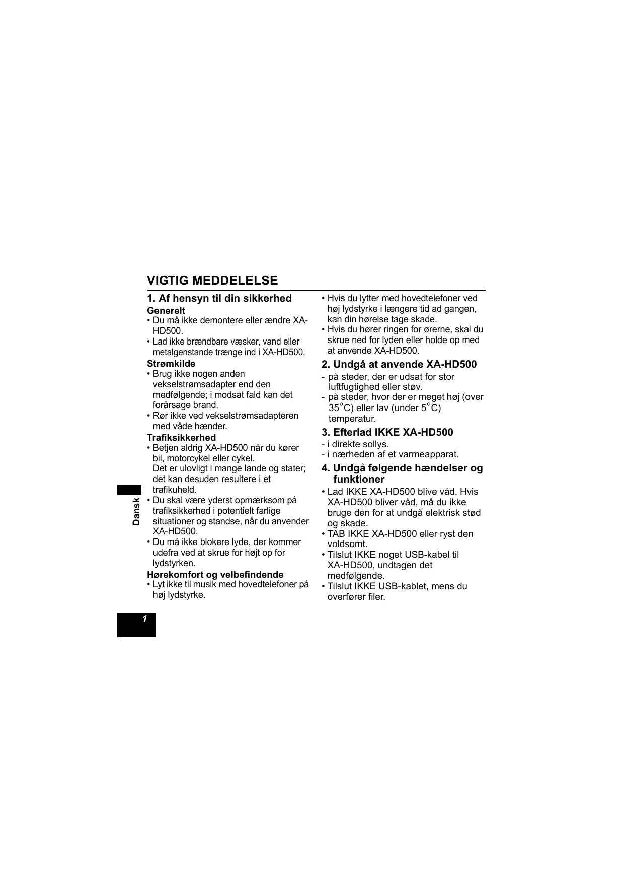[Europese Unie] Dit symbool toont dat de elektrische en elektronische apparatuur, wanneer niet meer nodig, niet zo maar met het gewone huisvuil mag worden weggegooid. Het product moet daarentegen naar een verzamelpunt voor het recyclen van elektrische en elektronische apparatuur worden gebracht voor een juiste verwerking, herstel en recycling in overeenstemming met de nationale wetgeving. • N’utilisez pas un autre adaptateur secteur que celui qui est fourni; sinon, cela pourrait entraîner un incendie. • Ne manipulez pas l’adaptateur secteur avec les mains mouillées. Sécurité relative à la circulation • N’utilisez jamais le XA-HD500 en conduisant une voiture, une moto ou un vélo. C’est interdit dans beaucoup de pays et régions; et cela pourrait aussi entraîner un accident de la circulation. • Vous devez faire très attention à la sécurité relative à la circulation dans des situations potentiellement dangereuse et arrêter d’utiliser le XA-HD500. • Ne bloquez pas les sons extérieurs en réglant le volume trop haut. Confort d’écoute et bien-être • N’écoutez pas de la musique avec le casque d’écoute à un niveau de volume élevé.