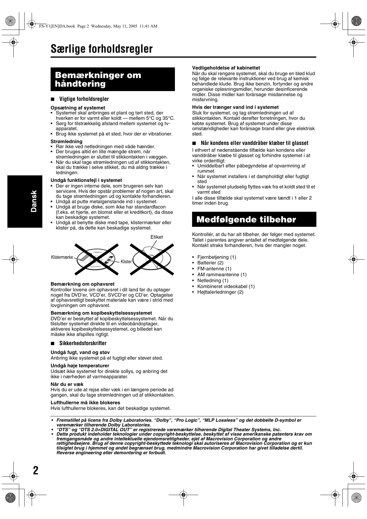 Le nombre entre parenthèses représente la quantité des pièces fournies. S’il manque un ou des éléments, appelez le revendeur immédiatement. • • • Ne placez pas le système dans un lieu humide ou poussiéreux. Évitez les températures élevées N’exposez pas le système à la lumière directe du soleil et ne le placez pas à proximité d’une source de chaleur. • Fabriqué sous licence de Dolby Laboratoires. “Dolby”, “Pro Logic”, “MLP Lossless” et le symbole des deux D sont des marques commercials de Dolby Laboratories. • “DTS” et “DTS 2.0+DIGITAL OUT” sont des marques déposées de Digital Theater Systems, Inc. • Ce produit incorpore une technologie de protection des droits d’auteur protégée par des réclamations de méthode de certains brevets américains et autres droits de propriété intellectuelle que possède Macrovision Corporation et d’autres propriétaires de droits. L’utilisation de cette technologie de protection des droits d’auteur doit être autorisée par Macrovision Corporation, et elle est prévue pour une utilisation à domicile et d’autres visualisations limitées uniquement, sauf autorisation expresse de Macrovision Corporation. L’ingénierie inverse ou le désassemblage sont interdits.