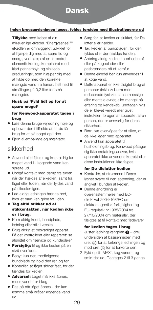 Tillykke med købet af din miljøvenlige elkedel. ‘Energysense’™ elkedlen er omhyggeligt udviklet for at hjælpe dig med at spare tid og energi, ved hjælp af en forbedret elementteknologi kombineret med klart gennemsyn og vinklede gradueringer, som hjælper dig med at fylde op med den korrekte mængde vand fra hanen, helt ned til afmålinger på 0,2 liter for små mængder.