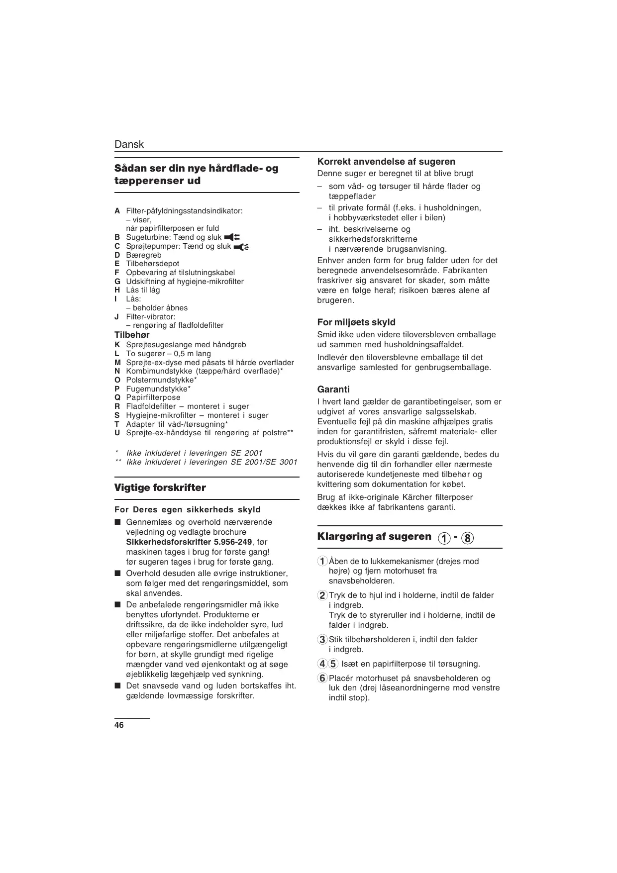 - Ikke inkluderet i leveringen SE 2001 ** Ikke inkluderet i leveringen SE 2001/SE 3001 Vigtige forskrifter For Deres egen sikkerheds skyld ■ Gennemlæs og overhold nærværende vejledning og vedlagte brochure Sikkerhedsforskrifter 5.956-249, før maskinen tages i brug for første gang! før sugeren tages i brug for første gang. ■ Overhold desuden alle øvrige instruktioner, som følger med det rengøringsmiddel, som skal anvendes. ■ De anbefalede rengøringsmidler må ikke benyttes ufortyndet. Produkterne er driftssikre, da de ikke indeholder syre, lud eller miljøfarlige stoffer. Det anbefales at opbevare rengøringsmidlerne utilgængeligt for børn, at skylle grundigt med rigelige mængder vand ved øjenkontakt og at søge øjeblikkelig lægehjælp ved synkning. ■ Det snavsede vand og luden bortskaffes iht. gældende lovmæssige forskrifter.