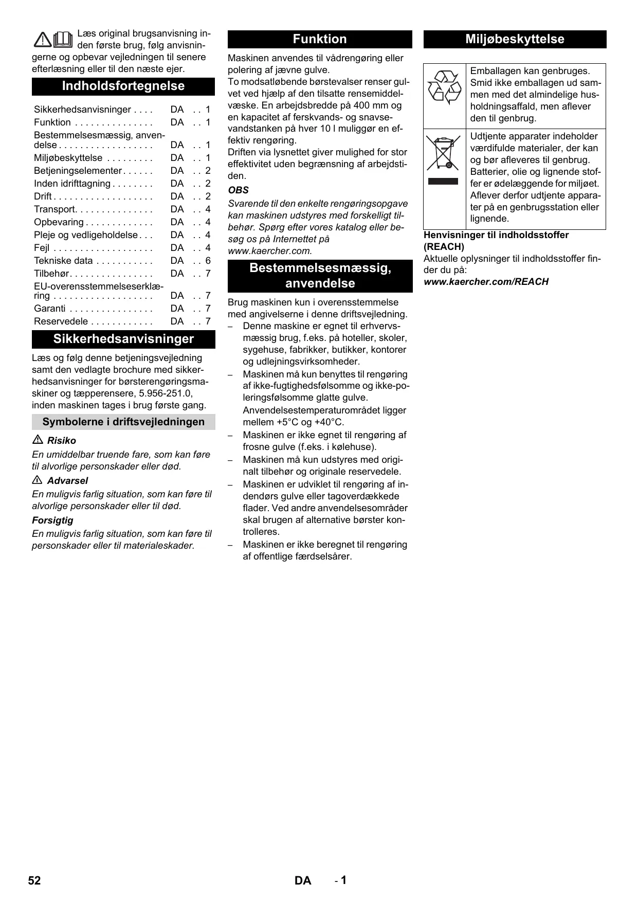 DA . . 7 DA . . 7 DA . . 7 Sikkerhedsanvisninger Læs og følg denne betjeningsvejledning samt den vedlagte brochure med sikkerhedsanvisninger for børsterengøringsmaskiner og tæpperensere, 5.956-251.0, inden maskinen tages i brug første gang. Symbolerne i driftsvejledningen Risiko En umiddelbar truende fare, som kan føre til alvorlige personskader eller død. 몇 Advarsel En muligvis farlig situation, som kan føre til alvorlige personskader eller til død. Forsigtig En muligvis farlig situation, som kan føre til personskader eller til materialeskader.