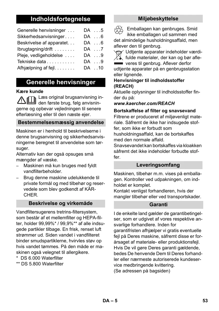 Generelle henvisninger Kære kunde Læs original brugsanvisning inden første brug, følg anvisningerne og opbevar vejledningen til senere efterlæsning eller til den næste ejer. Bestemmelsesmæssig anvendelse Maskinen er i henhold til beskrivelserne i denne brugsanvisning og sikkerhedsanvisningerne beregnet til anvendelse som tørsuger. Alternativ kan der også opsuges små mængder af væske. – Maskinen må kun bruges med fyldt vandfilterbeholder. – Brug denne maskine udelukkende til private formål og med tilbehør og reservedele som blev godkendt af KÄRCHER. Emballagen kan genbruges. Smid ikke emballagen ud sammen med det almindelige husholdningsaffald, men aflever den til genbrug. Udtjente apparater indeholder værdifulde materialer, der kan og bør afleveres til genbrug. Aflever derfor udtjente apparater på en genbrugsstation eller lignende. Henvisninger til indholdsstoffer (REACH) Aktuelle oplysninger til indholdsstoffer finder du på: www.kaercher.com/REACH Bortskaffelse af filter og snavsevand Filtrene er produceret af miljøvenligt materiale. Såfremt de ikke har indsugede stoffer, som ikke er forbudt som husholdningsaffald, kan de bortskaffes med den normale affald. Snavsevandet kan bortskaffes via kloakken såfremt det ikke indeholder forbudte stoffer. Leveringsomfang Maskinen, tilbehør m.m. vises på emballagen. Kontroller ved udpakningen, om indholdet er komplet. Kontakt venligst forhandleren, hvis der mangler tilbehør eller ved transportskader. Beskrivelse og virkemåde Garanti Vandfiltersugerens tretrins-filtersystem, som består af et mellemfilter og HEPA-filter, holder 99,99%* / 99,9%** af alle indsugede partikler tilbage. En frisk, renset luft strømmer ud. Siden vandet i vandfilteret binder smudspartiklerne, hvirvles støv op hvis vandet tømmes. På den måde er maskinen også velegnet til allergikere.