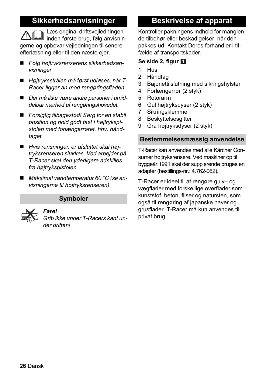 Attention au recul ! Assurer une bonne stabilité et bien tenir le pistolet haute pression avec la rallonge ou la poignée. Mettre le nettoyeur haute pression hors service à la fin du nettoyage. Lors du travail sur le T-Racer, séparer de plus celui-ci du pistolet haute pression. Température d’eau maximale 60 °C (observer les instructions de votre nettoyeur haute pression).