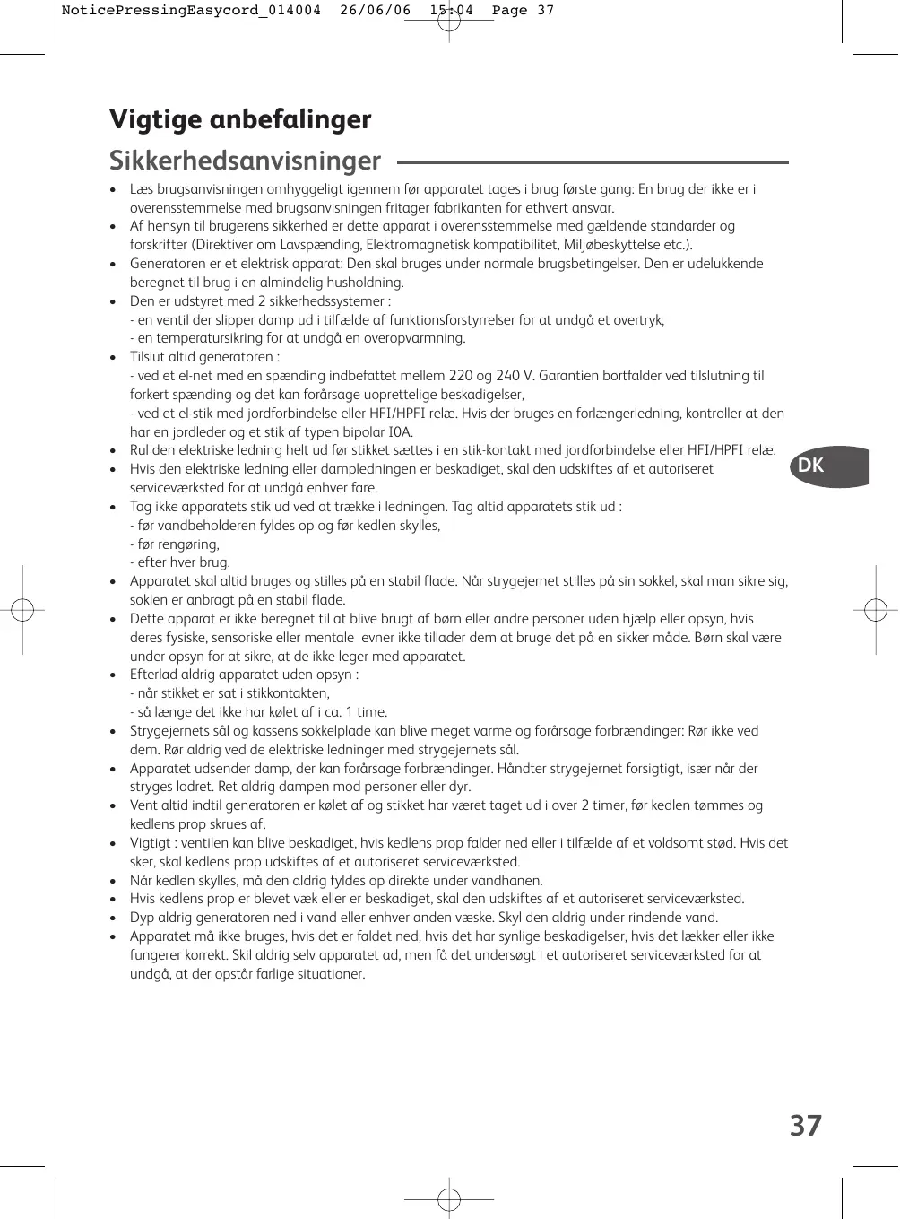 NoticePressingEasycord_ 014004 26/06/06 & Page 37 Vigtige anbefalinger Sikkerhedsanvisninger + Læs brugsanvisningen omhyggeligt igennem far apparatet tages i brug farste gang: En brug der ikke er i overensstemmelse med brugsanvisningen fritager fabrikanten for ethvert ansvar. + Af hensyn til brugerens sikkerhed er dette apparat i overensstemmelse med gældende standarder og forskrifter (Direktiver om Lavspænding, Elektromagnetisk kompatibilitet, Miljebeskyttelse etc.) + Generatoren er et elektrisk apparat: Den skal bruges under normale brugsbetingelser. Den er udelukkende beregnet til brug i en almindelig husholdning. + Den er udstyret med 2 sikkerhedssystemer - en ventil der slipper damp ud itiffælde af funktionsforstyrrelser for at undgä et overtryk, - en temperatursikring for at undgä en overopvarmning, + Tilslut altid generatoren - ved et elnet med en spænding indbefattet mellem 220 og 240 V. Garantien bortfalder ved tislutning ti forkert spænding og det kan forärsage uoprettelige beskadigelser, - ved et el-stik med jordforbindelse eller HFL/HPFI relæ. Hvis der bruges en forlængerledning, kontroller at den har en jordieder og et stik af typen bipolar I0A. + Rul den elektriske ledning helt ud for stikket sættes 1 en stik-kontakt med jordforbindelse eller HFI/HPFI relæ. Ex | + Hvis den elektriske ledning eller dampledningen er beskadiget, skal den udskiftes af et autoriseret serviceværksted for at undgà enhver fare. + Tag ikke apparatets stik ud ved at trække i ledningen. Tag altid apparatets stik ud : - far vandbeholderen fyides op og fer kedien skyles, - far rengaring. - efter hver brug. + Apparatet skal altid bruges og stiles pà en stabil flade. När strygejernet stilles pà sin sokkel, skal man sikre sig, soklen er anbragt pà en stabil flade. + Dette apparat er ikke beregnet til at blive brugt af barn eller andre personer uden hjælp eller opsyn, hvis deres fysiske, sensoriske eller mentale evner ikke tillader dem at bruge det pà en sikker mäde. Born skal være under opsyn for at sikre, at de ikke leger med apparatet. + Efterlad aldrig apparatet uden opsyn - nàr stikket er sat i stikkontakten, - sà længe det ikke har kalet af i ca. 1 time. + Strygejernets säl og kassens sokkelplade kan blive meget varme og forärsage forbrændinger: Rer ikke ved dem. Rer aldrig ved de elektriske ledninger med strygejemets sl. + Apparatet udsender damp, der kan forärsage forbrændinger. Händter strygejernet forsigtigt, især nàr der stryges lodret. Ret aldrig dampen mod personer eller dyr. + Vent altid indtil generatoren er kalet af og stikket har været taget ud i over 2 timer, far kedlen tommes og kedlens prop skrues af. + Vigtigt : ventilen kan blive beskadiget, hvis kedlens prop falder ned eller i tifælde af et voldsomt stod. Hvis det sker, skal kediens prop udskiftes af et autoriseret serviceværksted + När kedlen skylles, mâ den aldrig fyides op direkte under vandhanen. + Hvis kedlens prop er blevet væk eller er beskadiget, skal den udskiftes af et autoriseret serviceværksted + Dyp aldrig generatoren ned | vand eller enhver anden væske. Skyl den aldrig under rindende vand + Apparatet mà ikke bruges, vis det er faldet ned, huis det har synlige beskadigelser, hvis det lækker elle ke fungerer korrekt. Ski aldrig selv apparatet ad, men fà det undersagt i et autoriseret serviceværksted for at undgä, at der opstär farlige situationer.