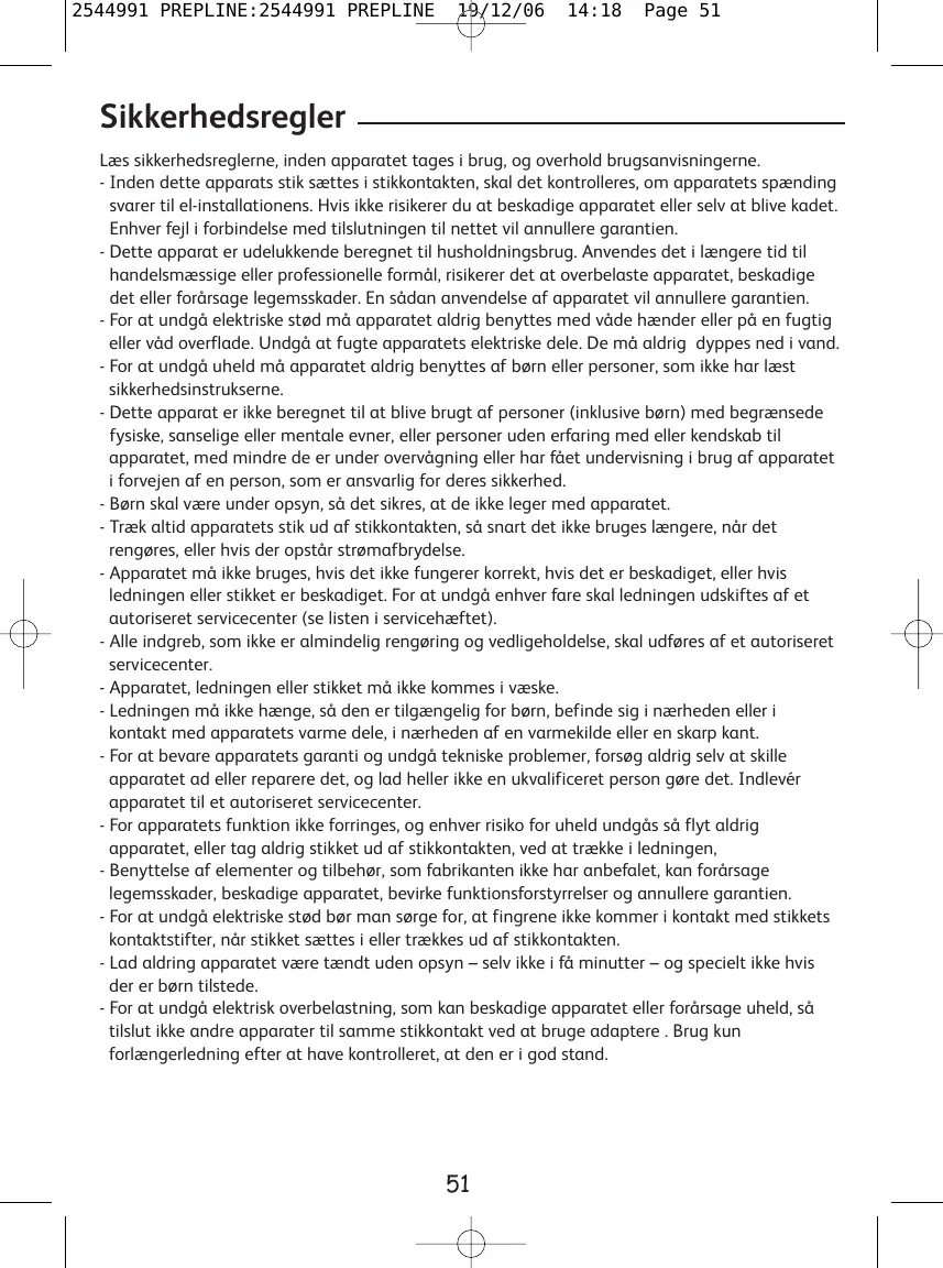 - Cet appareil est destiné uniquement à un usage domestique. Son utilisation prolongée à des fins commerciales et professionnelles risque de surcharger l'appareil et d'endommager celui-ci ou de provoquer des blessures corporelles. Une utilisation dans de telles conditions annule la garantie de l'appareil. - Pour éviter les chocs électriques, n'utilisez jamais l'appareil avec les mains mouillées ou sur une surface humide ou mouillée. Evitez de mouiller les composants électriques de l'appareil et ne les plongez jamais dans l'eau. - Pour éviter les accidents, ce produit ne doit pas être utilisé par un enfant ou par toute personne n'ayant pas lu les instructions. - Cet appareil n'est pas prévu pour être utilisé par des personnes ( y compris les enfants ) dont les capacités physiques, sensorielles ou mentales sont réduites, ou des personnes dénuées d'expérience ou de connaissance, sauf si elles ont pu bénéficier, par l'intermédiaire d'une personne responsable de leur sécurité, d'une surveillance ou d'instructions préalables concernant l'utilisation de l'appareil. - Il convient de surveiller les enfants pour s'assurer qu'ils ne jouent pas avec l'appareil. - Débranchez toujours l’appareil dès que vous cessez de l’utiliser, lorsque vous le nettoyez ou en cas de coupure de courant. - N’utilisez pas votre appareil s’il ne fonctionne pas correctement, s’il a été endommagé ou si le câble d’alimentation ou la fiche sont endommagés. Afin d’éviter tout danger,faites-les obligatoirement remplacer par un centre de service agréé (voir liste dans le livret service). - Toute intervention autre que le nettoyage et l’entretien usuel par le client doit être effectuée par un centre de service agréé.- Ne mettez pas l’appareil, le câble d’alimentation ou la fiche dans du liquide. - Ne laissez pas le câble d’alimentation pendre à portée de mains des enfants, être à proximité ou en contact avec les parties chaudes de l’appareil, près d’une source de chaleur ou sur un angle vif. Utilisez l’enrouleur de cordon pour le ranger. - Pour conserver la garantie de l'appareil et éviter tout problème technique, n'essayez jamais de démonter ou de réparer vous-même l'appareil et ne laissez aucune personne non qualifiée le faire. Portez l'appareil dans un service après-vente agréé. - Ne déplacez ni ne débranchez jamais l'appareil en tirant sur le cordon d'alimentation pour ne pas altérer le bon fonctionnement de l'appareil et éviter tout risque d'accident. - L'utilisation d'éléments et d'accessoires non recommandés par le fabricant peut provoquer des blessures corporelles, endommager l'appareil, entraîner son mauvais fonctionnement et annuler sa garantie, - Pour éviter les chocs électriques, assurez-vous que vos doigts n'entrent pas en contact avec les broches de la prise lorsque vous branchez ou débranchez l'appareil. - Ne laissez pas l'appareil en fonctionnement ou branché sur sa prise lorsque vous vous éloignez, même pour quelques instants, surtout en présence d'enfants. - Ne branchez pas d'autres appareils sur la même prise secteur en utilisant des adaptateurs, afin d'éviter toute surcharge électrique susceptible d'endommager l'appareil ou de provoquer des accidents. N’utilisez un prolongateur qu’après avoir vérifié que celui-ci est en bon état.