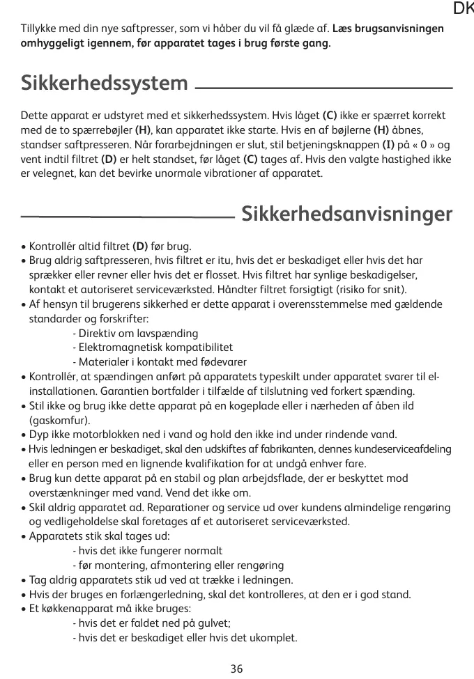 Tillykke med din nye saftpreser, som vi haber du vil fá glaede af. Laes brugsanvisningen omhyggeligt igennem, for apparatet tages i brug Forste gang.