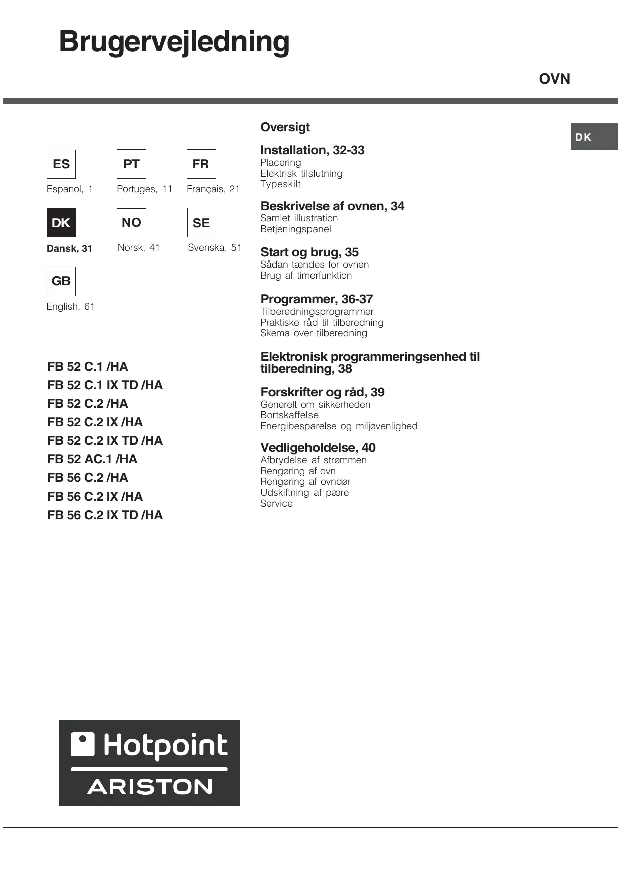 FB 56 C.2 IX TD /HA - Indbygningsovn HOTPOINT - Notice d'utilisation et mode d'emploi gratuit