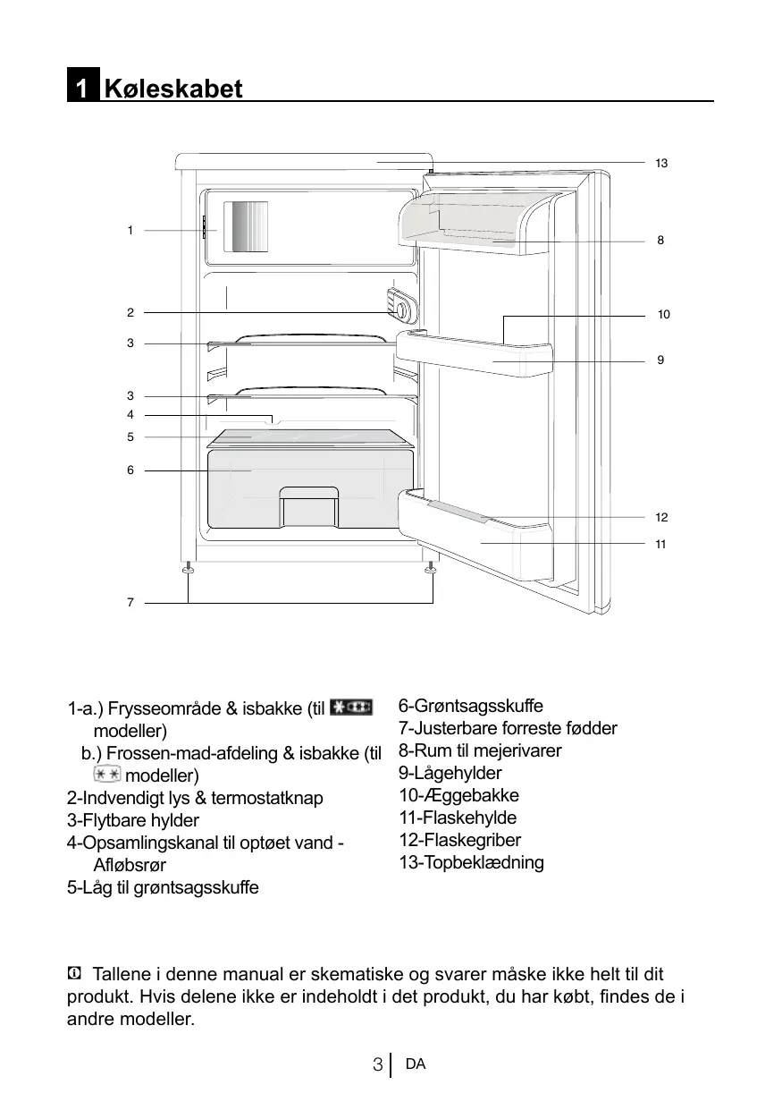 - * modeller) 9-Lägehylider 2-Indvendigt lys & termostatknap 10-Æggebakke 3-Flytbare hylder 11-Flaskehyide 4-Opsamlingskanal til optaet vand - 12-Flaskegriber Aflwbsror 13-Topbeklædning 5-Lâg til grantsagsskuffe @ Tallene i denne manual er skematiske og svarer mâske ikke helt til dit produkt. Hvis delene ikke er indeholdt i det produkt, du har kobt, findes de i andre modeller. 3| DA