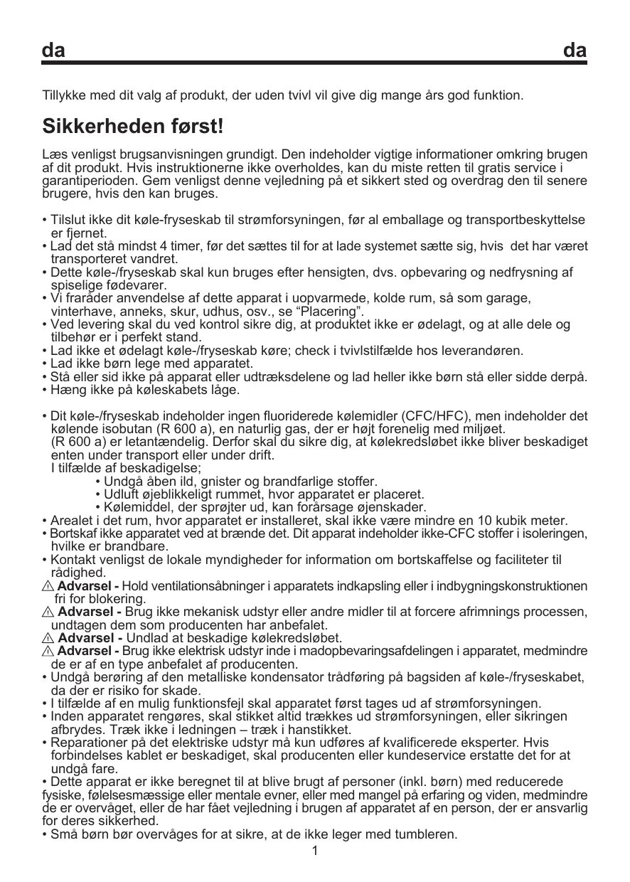 - Kontakt venligst de lokale myndigheder for information om bortskaffelse og faciliteter til rådighed. Advarsel - Hold ventilationsåbninger i apparatets indkapsling eller i indbygningskonstruktionen fri for blokering. Advarsel - Brug ikke mekanisk udstyr eller andre midler til at forcere afrimnings processen, undtagen dem som producenten har anbefalet. Advarsel - Undlad at beskadige kølekredsløbet. Advarsel - Brug ikke elektrisk udstyr inde i madopbevaringsafdelingen i apparatet, medmindre de er af en type anbefalet af producenten.