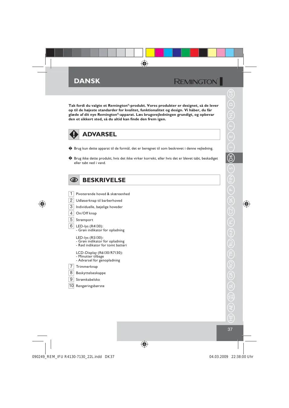NL F Tak fordi du valgte et Remington®-produkt. Vores produkter er designet, så de lever op til de højeste standarder for kvalitet, funktionalitet og design. Vi håber, du får glæde af dit nye Remington®-apparat. Læs brugsvejledningen grundigt, og opbevar den et sikkert sted, så du altid kan finde den frem igen.