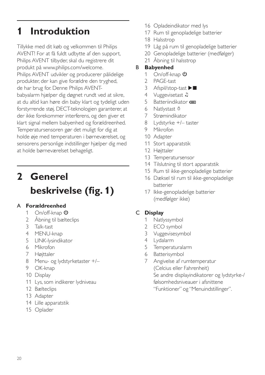 16 Opladeindikator med lys 17 Rum til genopladelige batterier 18 Halsstrop 19 Låg på rum til genopladelige batterier 20 Genopladelige batterier (medfølger) 21 Åbning til halsstrop Babyenhed 1 On/off-knap 3 2 PAGE-tast 3 Afspil/stop-tast E 4 Vuggevisetast K 5 Batteriindikator T 6 Natlystast Q 7 Strømindikator 8 Lydstyrke +/– taster 9 Mikrofon 10 Adapter 11 Stort apparatstik 12 Højttaler 13 Temperatursensor 14 Tilslutning til stort apparatstik 15 Rum til ikke-genopladelige batterier 16 Dæksel til rum til ikke-genopladelige batterier 17 Ikke-genopladelige batterier (medfølger ikke) C Display 1 Natlyssymbol 2 ECO symbol 3 Vuggevisesymbol 4 Lydalarm 5 Temperaturalarm 6 Batterisymbol 7 Angivelse af rumtemperatur (Celcius eller Fahrenheit) Se andre displayindikatorer og lydstyrke-/ følsomhedsniveauer i afsnittene “Funktioner” og “Menuindstillinger”. Læs denne brugsvejledning omhyggeligt igennem, inden apparatet tages i brug, og gem den til eventuelt senere brug.