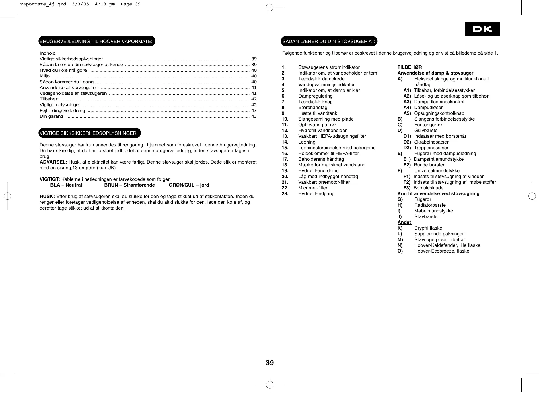 vapormate_4j.qxd 3/3/05 4:18 pm Page 39 BRUGERVEJLEDNING TIL HOOVER VAPORMATE: Indhold Vigtige sikkerhedsoplysninger Sädan lærer du din stevsuger at kende Hvad du ikke mé gare Mije … Sädan kommer du i gang Anvendelse af stevsugeren Vedligeholdelse af stavsugeren Tilbehor … Vigtige oplysninger Fejifindingsveiledning Din garanti …
