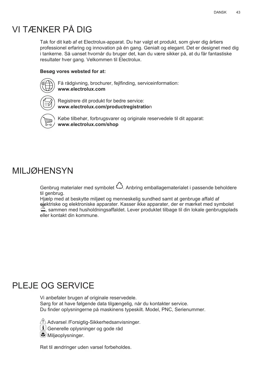 Tak for dit køb af et Electrolux-apparat. Du har valgt et produkt, som giver dig årtiers professionel erfaring og innovation på én gang. Genialt og elegant. Det er designet med dig i tankerne. Så uanset hvornår du bruger det, kan du være sikker på, at du får fantastiske resultater hver gang. Velkommen til Electrolux. Besøg vores websted for at: Få rådgivning, brochurer, fejlfinding, serviceinformation: www.electrolux.com Registrere dit produkt for bedre service: www.electrolux.com/productregistration Købe tilbehør, forbrugsvarer og originale reservedele til dit apparat: www.electrolux.com/shop MILJØHENSYN Genbrug materialer med symbolet . Anbring emballagematerialet i passende beholdere til genbrug. Hjælp med at beskytte miljøet og menneskelig sundhed samt at genbruge affald af elektriske og elektroniske apparater. Kasser ikke apparater, der er mærket med symbolet , sammen med husholdningsaffaldet. Lever produktet tilbage til din lokale genbrugsplads eller kontakt din kommune.