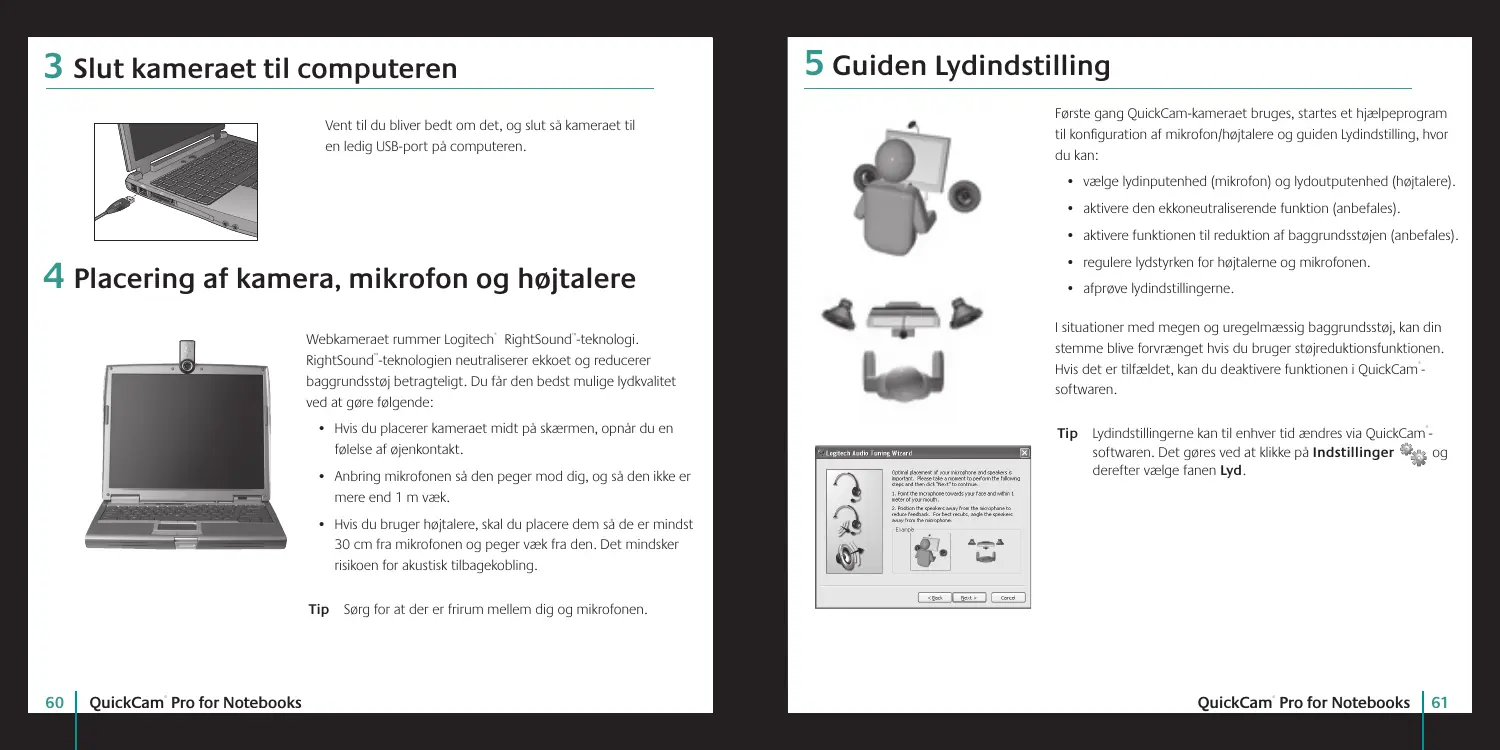 Webkameraet rummer Logitech RightSound -teknologi. RightSound -teknologien neutraliserer ekkoet og reducerer baggrundsstøj betragteligt. Du får den bedst mulige lydkvalitet ved at gøre følgende: