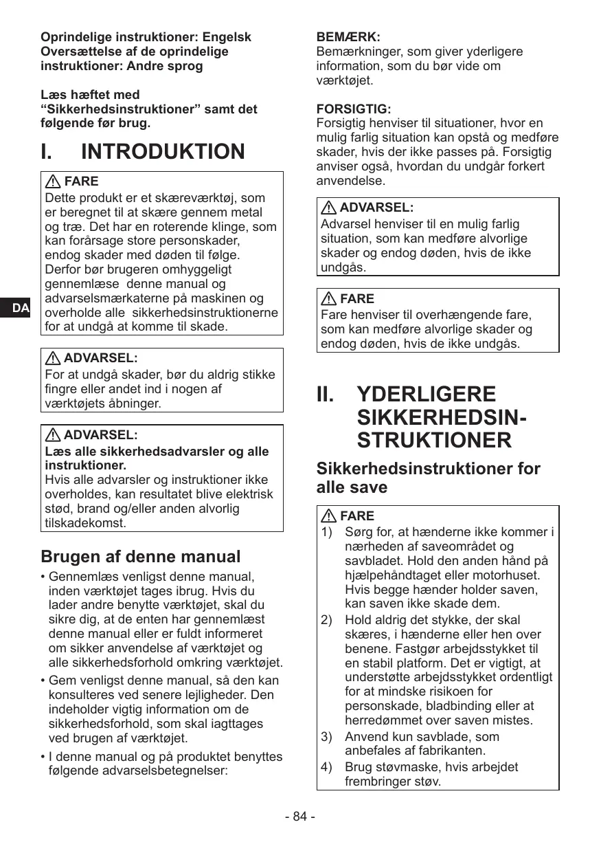 Dette produit er et skareveerktj, som er beregnet til at skare gennem metal og træ. Det har en roterende klinge, som kan forarsage store personskader, endog skader med døden til følge. Derfor bør brugeren omhyggeligt gennemlæse dette manual og advanselsmaerkaterne på maskinen og overholde alle sikkerhedsinstruktionerne for at undgå atkommen til skade.
