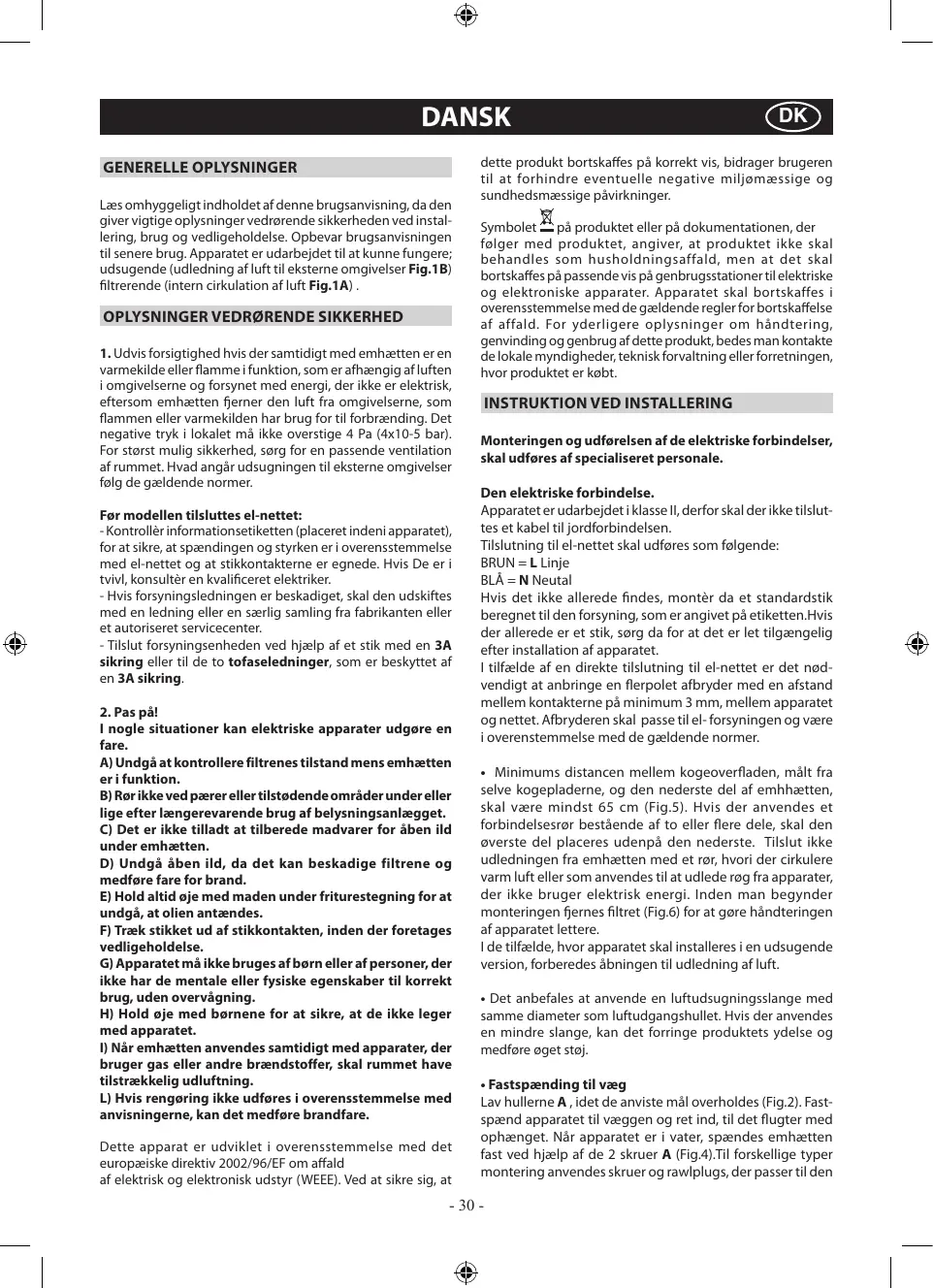 1. Attention, lorsque dans la même pièce vous utilisez simultanément la hotte à évacuation avec un brûleur ou une cheminée alimentés par une énergie autre que l’électricité, vous pouvez créer un problème “d’inversion de flux”. Dans ce cas la hotte aspire l’air nécessaire à leur combustion. La dépression dans le local ne doit pas dépasser les 4 Pa (4x10-5 bar). Pour un fonctionnement en toute sécurité, n’oubliez pas de prévoir une ventilation suffisante du local. Pour l’évacuation vers l’extérieur, veuillez vous référer aux dispositions en vigueur dans votre pays.
