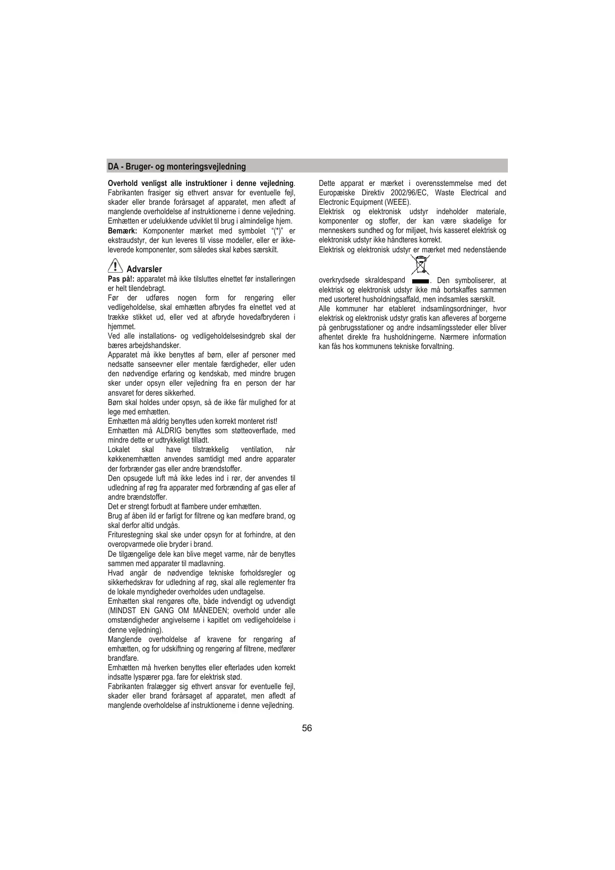 Advarsler Pas på!: apparatet må ikke tilsluttes elnettet før installeringen er helt tilendebragt. Før der udføres nogen form for rengøring eller vedligeholdelse, skal emhætten afbrydes fra elnettet ved at trække stikket ud, eller ved at afbryde hovedafbryderen i hjemmet. Ved alle installations- og vedligeholdelsesindgreb skal der bæres arbejdshandsker. Apparatet må ikke benyttes af børn, eller af personer med nedsatte sanseevner eller mentale færdigheder, eller uden den nødvendige erfaring og kendskab, med mindre brugen sker under opsyn eller vejledning fra en person der har ansvaret for deres sikkerhed. Børn skal holdes under opsyn, så de ikke får mulighed for at lege med emhætten. Emhætten må aldrig benyttes uden korrekt monteret rist! Emhætten må ALDRIG benyttes som støtteoverflade, med mindre dette er udtrykkeligt tilladt. Lokalet skal have tilstrækkelig ventilation, når køkkenemhætten anvendes samtidigt med andre apparater der forbrænder gas eller andre brændstoffer. Den opsugede luft må ikke ledes ind i rør, der anvendes til udledning af røg fra apparater med forbrænding af gas eller af andre brændstoffer. Det er strengt forbudt at flambere under emhætten. Brug af åben ild er farligt for filtrene og kan medføre brand, og skal derfor altid undgås. Friturestegning skal ske under opsyn for at forhindre, at den overopvarmede olie bryder i brand. De tilgængelige dele kan blive meget varme, når de benyttes sammen med apparater til madlavning. Hvad angår de nødvendige tekniske forholdsregler og sikkerhedskrav for udledning af røg, skal alle reglementer fra de lokale myndigheder overholdes uden undtagelse. Emhætten skal rengøres ofte, både indvendigt og udvendigt (MINDST EN GANG OM MÅNEDEN; overhold under alle omstændigheder angivelserne i kapitlet om vedligeholdelse i denne vejledning). Manglende overholdelse af kravene for rengøring af emhætten, og for udskiftning og rengøring af filtrene, medfører brandfare. Emhætten må hverken benyttes eller efterlades uden korrekt indsatte lyspærer pga. fare for elektrisk stød. Fabrikanten fralægger sig ethvert ansvar for eventuelle fejl, skader eller brand forårsaget af apparatet, men afledt af manglende overholdelse af instruktionerne i denne vejledning.