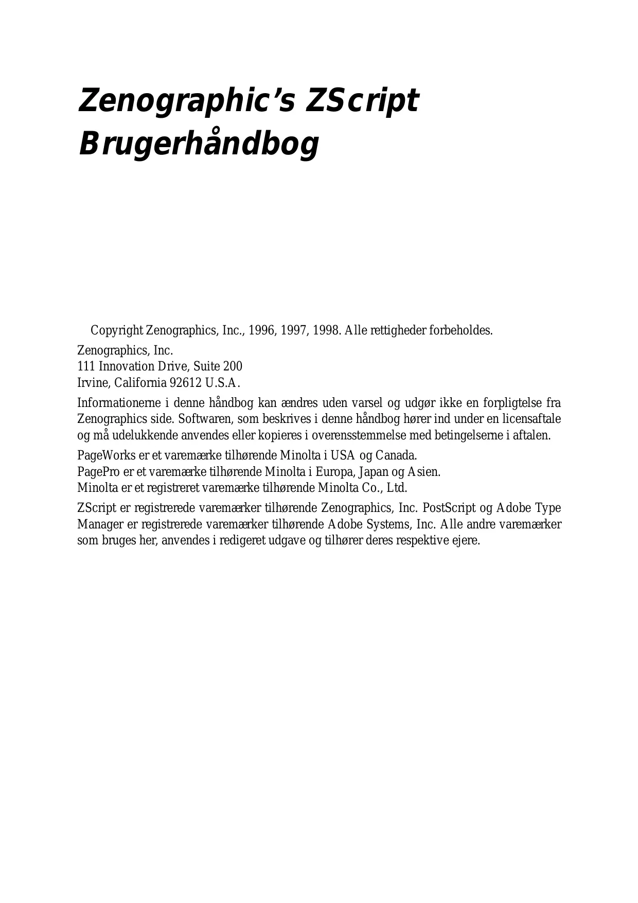 Zenographic’s ZScript Brugerhåndbog Copyright Zenographics, Inc., 1996, 1997, 1998. Alle rettigheder forbeholdes. Zenographics, Inc. 111 Innovation Drive, Suite 200 Irvine, California 92612 U.S.A. Informationerne i denne håndbog kan ændres uden varsel og udgør ikke en forpligtelse fra Zenographics side. Softwaren, som beskrives i denne håndbog hører ind under en licensaftale og må udelukkende anvendes eller kopieres i overensstemmelse med betingelserne i aftalen. PageWorks er et varemærke tilhørende Minolta i USA og Canada. PagePro er et varemærke tilhørende Minolta i Europa, Japan og Asien. Minolta er et registreret varemærke tilhørende Minolta Co., Ltd. ZScript er registrerede varemærker tilhørende Zenographics, Inc. PostScript og Adobe Type Manager er registrerede varemærker tilhørende Adobe Systems, Inc. Alle andre varemærker som bruges her, anvendes i redigeret udgave og tilhører deres respektive ejere. Indledning Da denne håndbog indeholder to versioner af Windows 95 og NT 4.0 - anvendes disse ikoner, hvor en række instruktioner er versionbestemte. Dette gør det muligt at gå direkte til instruktionerne.