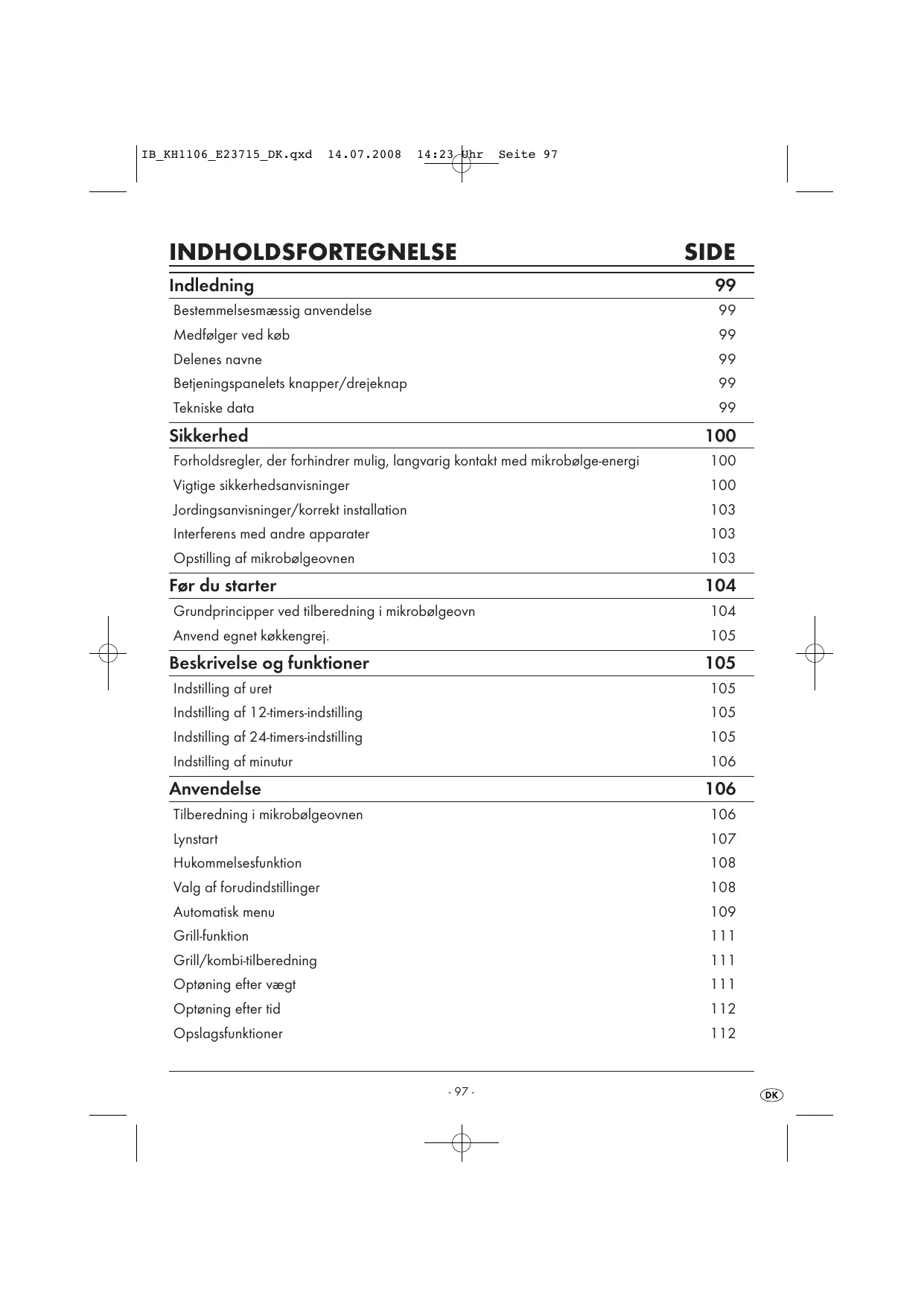 INDHOLDSFORTEGNELSE SIDE Indledning 99 Bestemmelsesmæssig anvendelse 99 Medfalger ved kob 9° Delenes navne 99 Beljeningspanelets knapper/drejeknap 9° Tekniske data 99 Sikkerhed 100 Forholdsregler, der forhindrer mulig, langvarig Kontakt med mikrobalge-energi 100 Vigtige sikkerhedsanvisninger 100 Jordingsanvisninger/korrekt installation 103 Interferens med andre apparater 103 Opstilling af mikrobalgeovnen 103 For du starter 104 Grundprincipper ved tilberedning i mikrobalgeovn 104 Anvend egnet kokkengreï. 105 Beskrivelse og funktioner 105 Indstiling af uret 105 Indstiling af 1 24imersindstiling 105 Indstiling af 24timersindstiling 105 Indstiling af minutur 106 Anvendelse 106 Tilberedning i mikrobalgeovnen 106 Lynstart 107 Hukommelsesfunktion 108 Valg af forudindstillinger 108 Automatisk menu 109 Grilkfunktion 111 Grill/kombitilberedning 111 Optening efter vægt ni Optening efter tid 112 Opslagsfunktioner 112 -97- æ