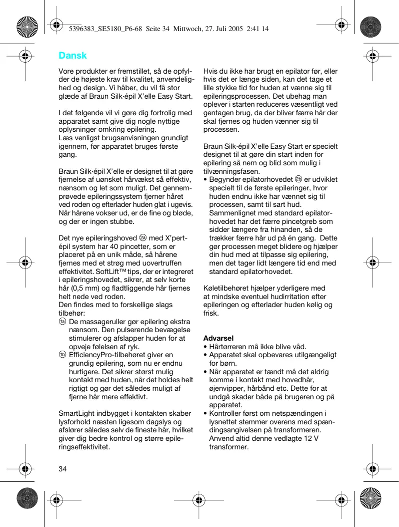 5396383_SE5180_P6-68 Seite 34 Mittwoch, 27. Juli 2005 2:41 14 Dansk Vore produkter er fremstillet, så de opfylder de højeste krav til kvalitet, anvendelighed og design. Vi håber, du vil få stor glæde af Braun Silk·épil X’elle Easy Start. I det følgende vil vi gøre dig fortrolig med apparatet samt give dig nogle nyttige oplysninger omkring epilering. Læs venligst brugsanvisningen grundigt igennem, før apparatet bruges første gang. Braun Silk·épil X’elle er designet til at gøre fjernelse af uønsket hårvækst så effektiv, nænsom og let som muligt. Det gennemprøvede epileringssystem fjerner håret ved roden og efterlader huden glat i ugevis. Når hårene vokser ud, er de fine og bløde, og der er ingen stubbe. Det nye epileringshoved B med X’pertépil system har 40 pincetter, som er placeret på en unik måde, så hårene fjernes med et strøg med uovertruffen effektivitet. SoftLift™ tips, der er integreret i epileringshovedet, sikrer, at selv korte hår (0,5 mm) og fladtliggende hår fjernes helt nede ved roden. Den findes med to forskellige slags tilbehør: A De massageruller gør epilering ekstra nænsom. Den pulserende bevægelse stimulerer og afslapper huden for at opveje følelsen af ryk. a EfficiencyPro-tilbehøret giver en grundig epilering, som nu er endnu hurtigere. Det sikrer størst mulig kontakt med huden, når det holdes helt rigtigt og gør det således muligt af fjerne hår mere effektivt. SmartLight indbygget i kontakten skaber lysforhold næsten ligesom dagslys og afslører således selv de fineste hår, hvilket giver dig bedre kontrol og større epileringseffektivitet.