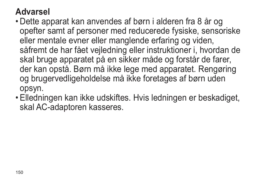 Advarsel • Dette apparat kan anvendes af børn i alderen fra 8 år og opefter samt af personer med reducerede fysiske, sensoriske eller mentale evner eller manglende erfaring og viden, såfremt de har fået vejledning eller instruktioner i, hvordan de skal bruge apparatet på en sikker måde og forstår de farer, der kan opstå. Børn må ikke lege med apparatet. Rengøring og brugervedligeholdelse må ikke foretages af børn uden opsyn. • Elledningen kan ikke udskiftes. Hvis ledningen er beskadiget, skal AC-adaptoren kasseres.