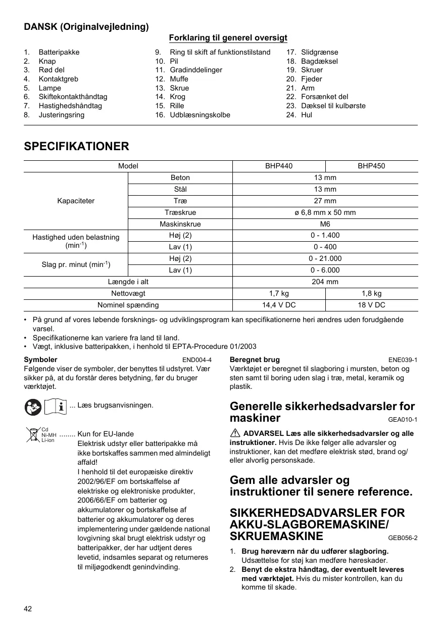 SPECIFIKATIONER Model EHP440 BHP450 Beton 13 mm Stäl 13 mm Kapaciteter Træ 27 mm Træskrue 6 6,8 mm x 50 mm Maskinskrue M6 Hastighed uden belastning Hoj (2) 0-1.400 {min} Lav (1) 0-400 Hoj (2) 0-21.000 Slag pr. minut (mir Lav (1) 0- 6.000 Længde alt 204 mm Nettovægt 17 kg TEkg Nominel spænding 144 VDC 18VDC + Pä grund af vores labende forsknings- og udviklingsprogram kan specifikationerne heri ændres uden forudgäende varsel. + Specifikationeme kan variere fra land til land. + Vægt, inklusive batteripakken, i henhold til EPTA-Procedure 01/2003 Symboler ENDO04-4 Folgende viser de symboler, der benyttes til udstyret. Vær sikker pâ, at du forstär deres betydning, for du bruger værktajet. @[i Læs brugsanvisningen. Kun for EU-lande Elektrisk udstyr eller batteripakke mâ ikke bortskaffes sammen med almindeligt affald! L'henhold til det europæiske direktiv 2002/96/EF om bortskaffelse af elektriske og elektroniske produkter, 2006/66/EF om batterier og akkumulatorer og bortskaffelse af batterier og akkumulatorer og deres implementering under gældende national lovgivning skal brugt elektrisk udstyr og batteripakker, der har udtjent deres levetid, indsamies separat og returneres til miljogodkendt genindvinding.