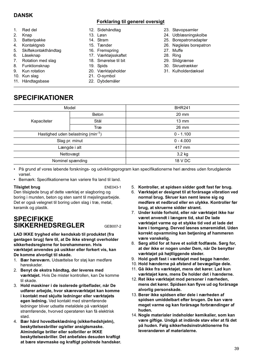LAD IKKE tryghed eller kendskab til produktet (fragentagen brug) fore til, at De ici strengt overholder sikkerhedsreglerne for borehammeren. Hvis varktojet anwendes pa usikker eller forkert vis, kan Dekommen alvorligt til skade.