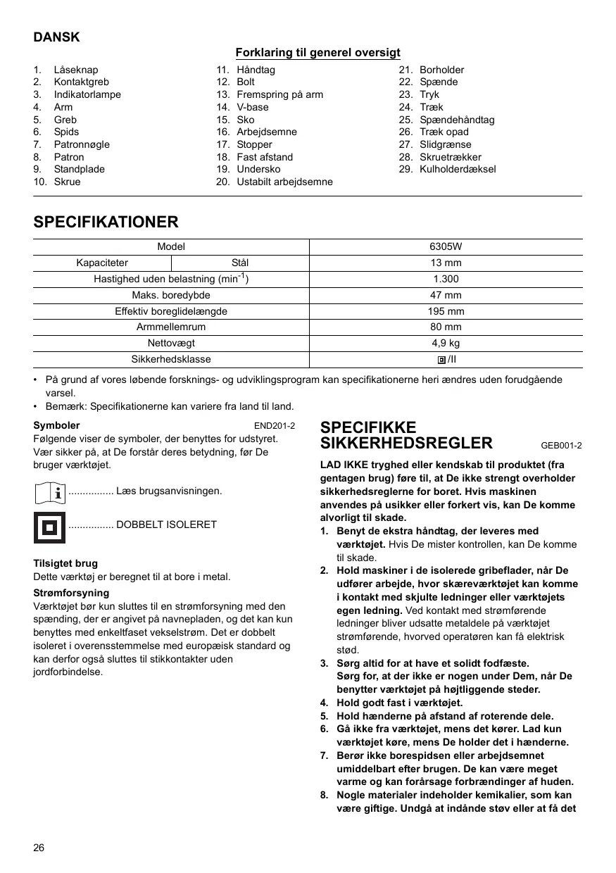SPECIFIKKE SIKKERHEDSREGLER GEB001-2 LAD IKKE tryghed eller kendskab til produktet (fra gentagen brug) føre til, at De ikke strengt overholder sikkerhedsreglerne for boret. Hvis maskinen anvendes på usikker eller forkert vis, kan De komme alvorligt til skade.