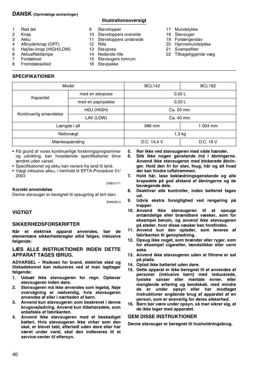 Mundstykke Støvsuger Forlængerstav Hjørnemundstykke Svampefilter Tilbageliggende væg SPECIFIKATIONER Model BCL142 BCL182 med en støvpose 0,50 L med en papirpakke 0,33 L HØJ (HIGH) Ca. 20 min. Kapacitet Kontinuerlig anvendelse LAV (LOW) Ca. 40 min. Længde i alt 986 mm Nettovægt Mærkespænding D.C. 14,4 V