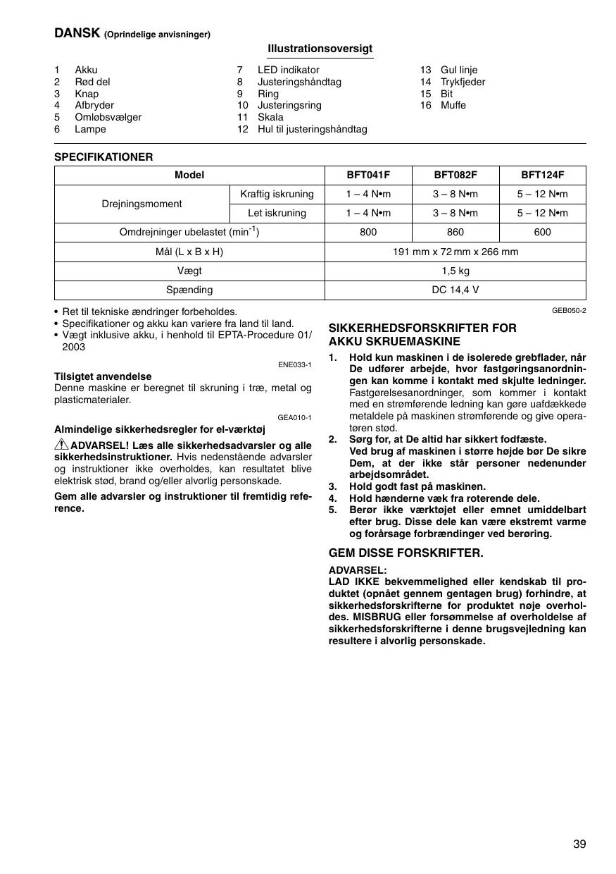 Tilsigtet anvendelse Denne maskine er beregnet til skruning i træ, metal og plasticmaterialer. GEA010-1 Almindelige sikkerhedsregler for el-værktøj ADVARSEL! Læs alle sikkerhedsadvarsler og alle sikkerhedsinstruktioner. Hvis nedenstående advarsler og instruktioner ikke overholdes, kan resultatet blive elektrisk stød, brand og/eller alvorlig personskade. Gem alle advarsler og instruktioner til fremtidig reference.